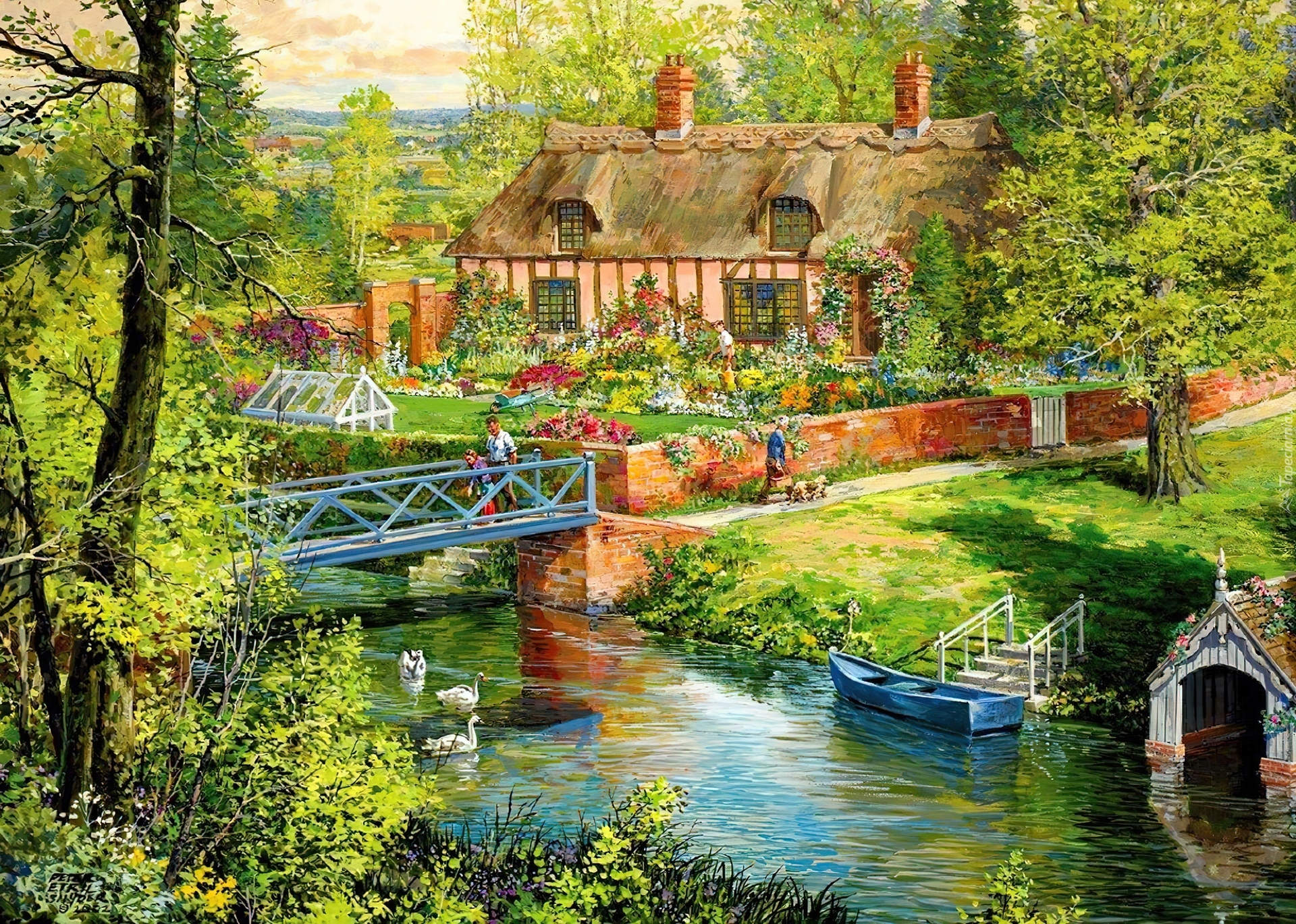 Edytor tapety: Dom, Rzeka, Most, Ludzie
