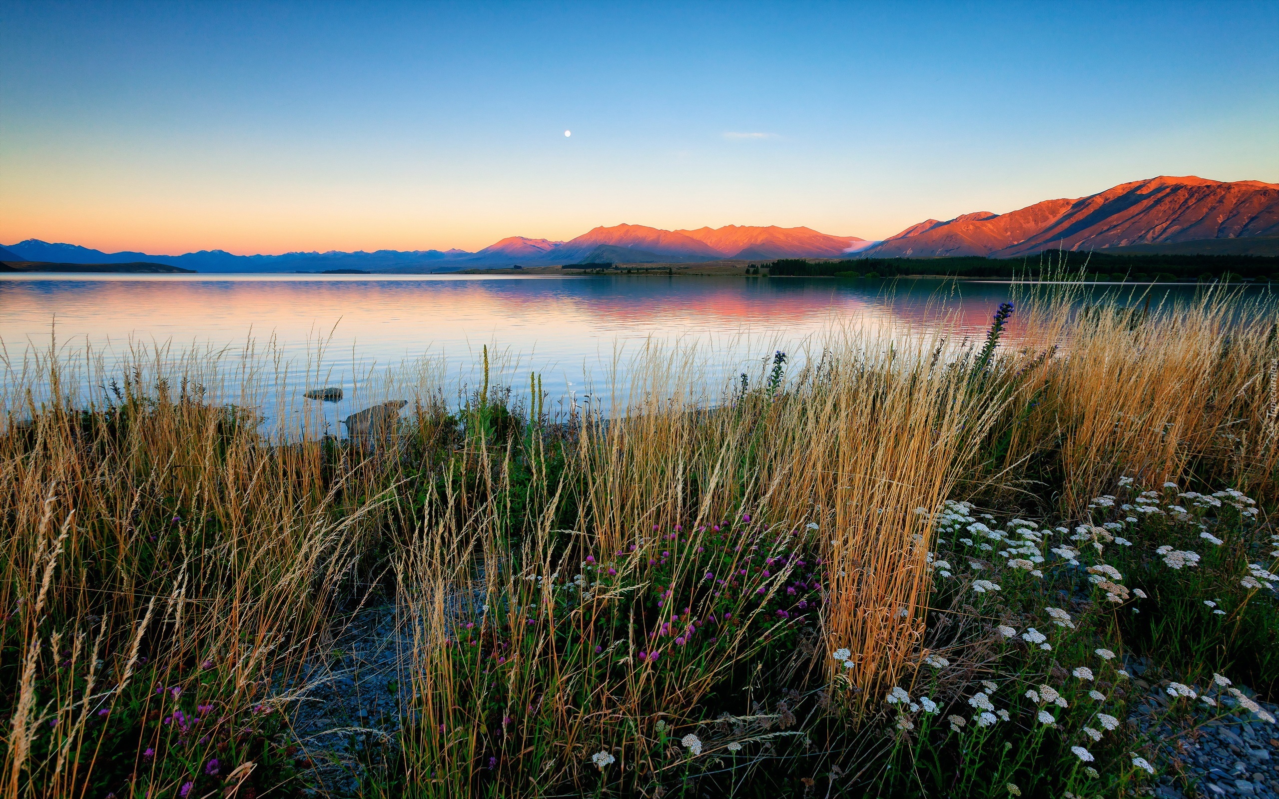 Edytor tapety: Rzeka, Góry, Trawy, Kwiaty, Zachód, Słońca