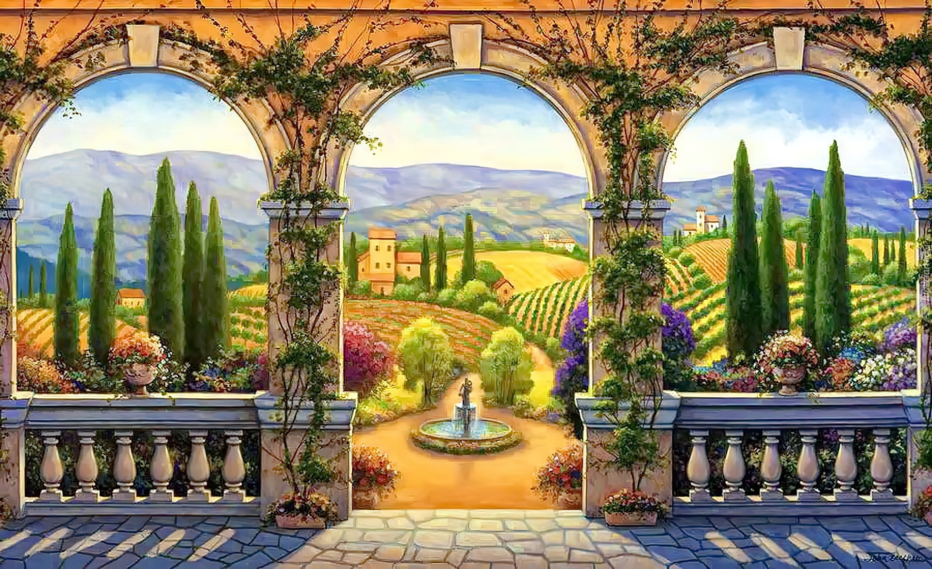 Edytor tapety: Taras, Ogród, Fontanna, Widoczek