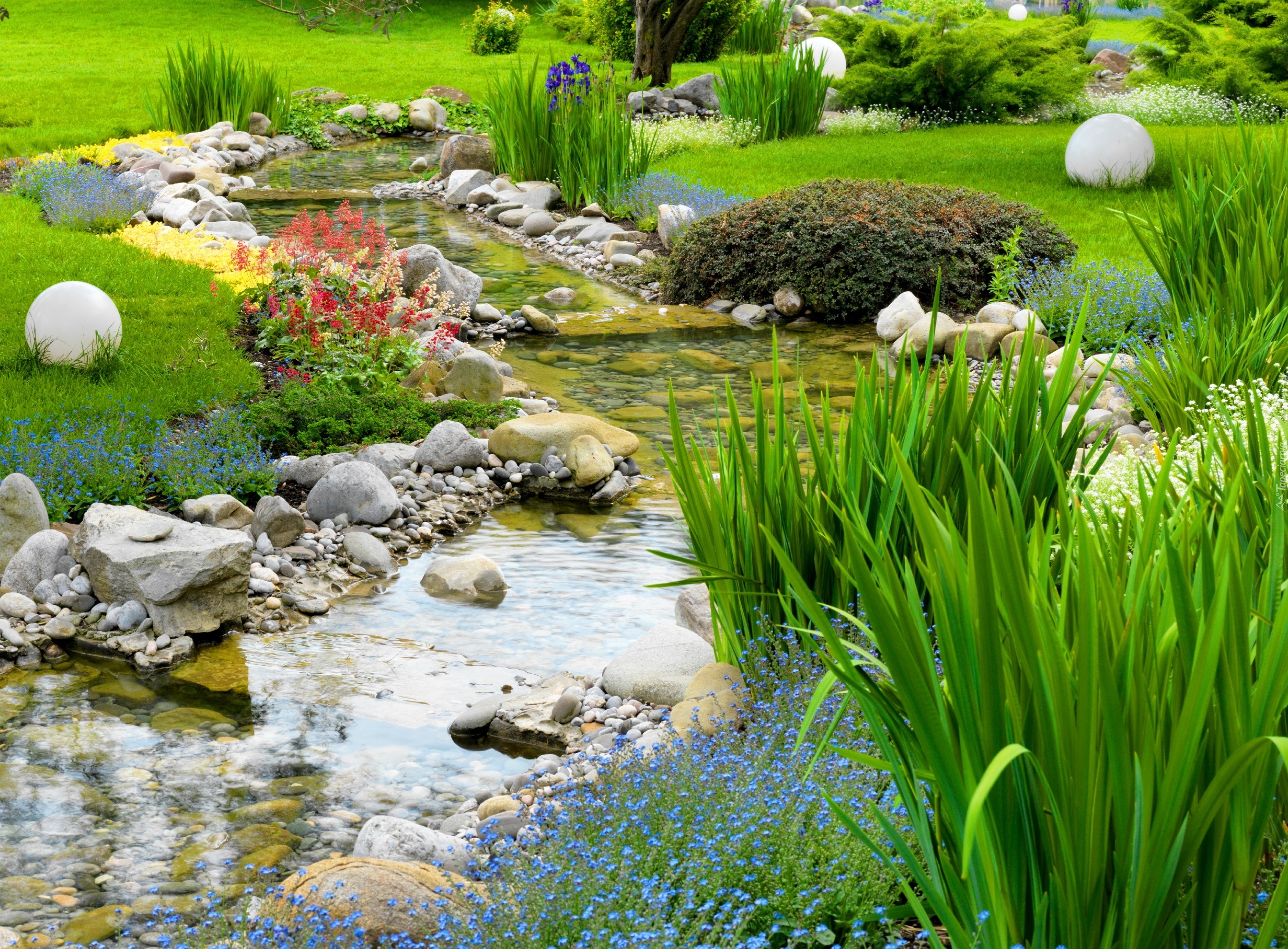 Edytor tapety: Ogród, Rzeczka, Kamienie, Kwiaty, Klomby