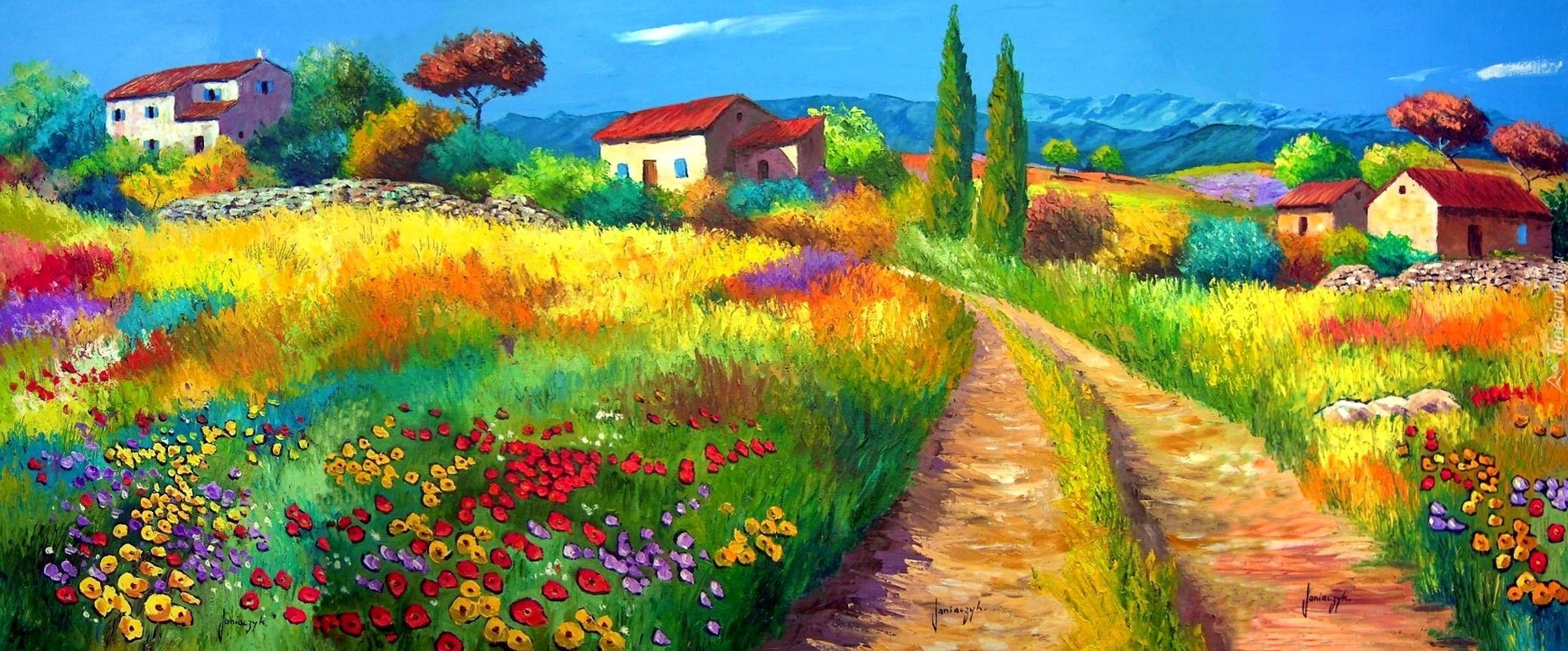 Edytor tapety: Droga, Łąka, Domy
