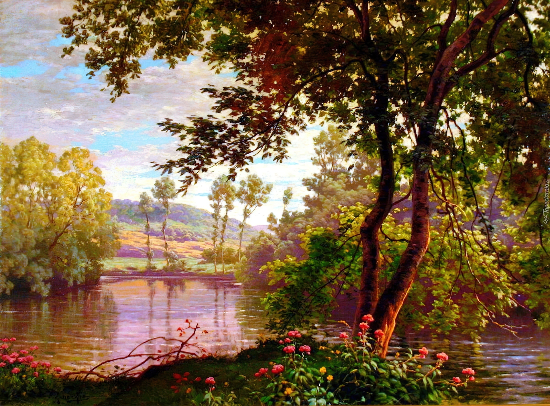 Edytor tapety: Jezioro, Drzewa, Kwiaty