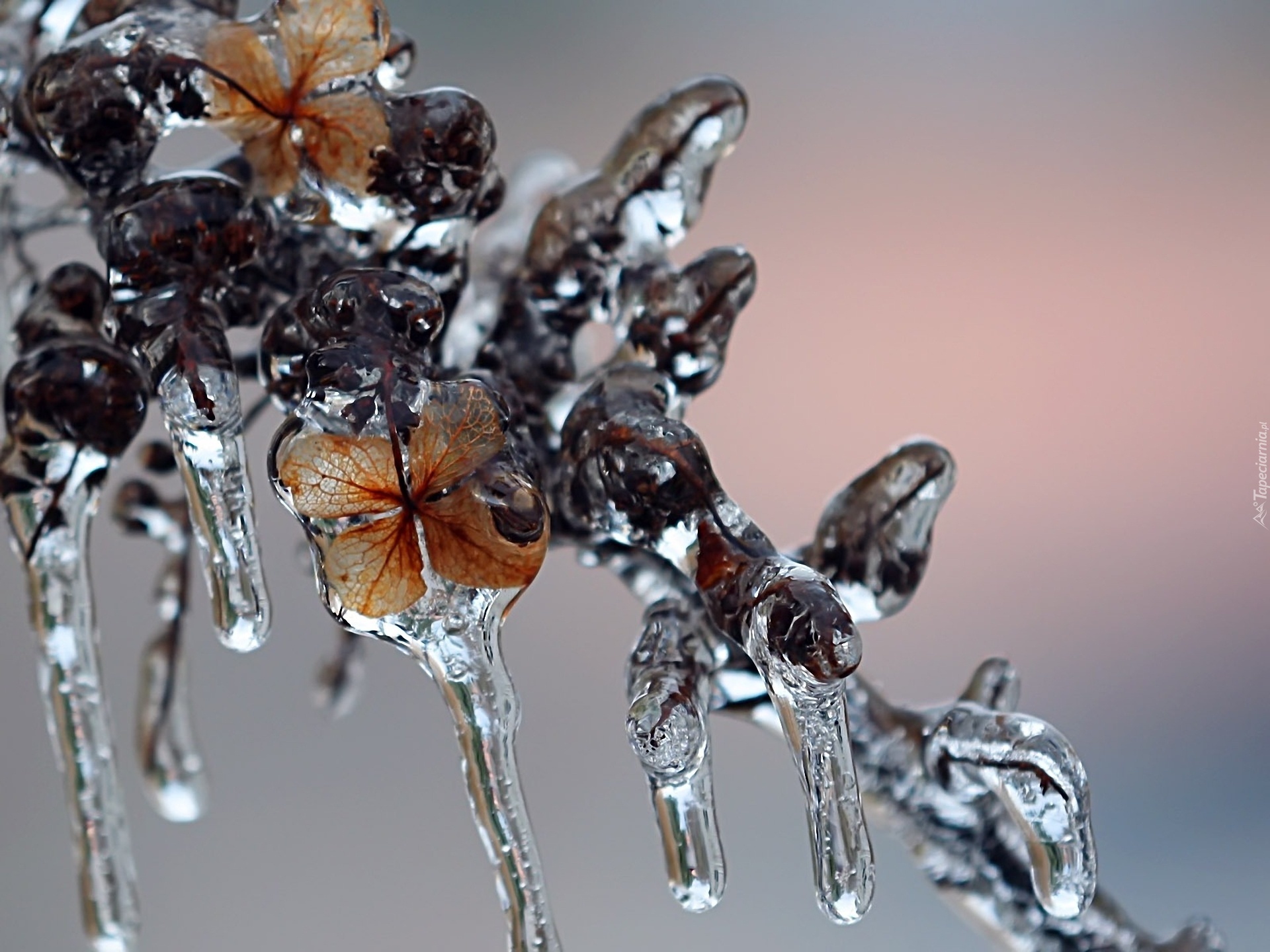 Edytor tapety: Zamarznięta, Gałąź, Liście, Sople, Zima