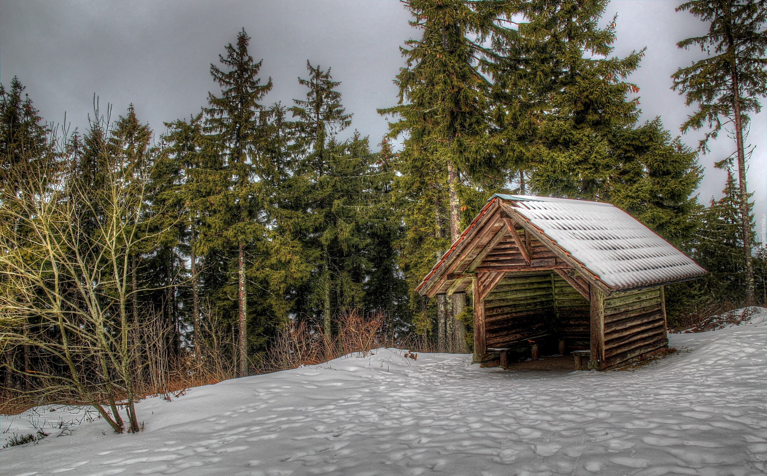Edytor tapety: Las, Domek, Śnieg, Zima