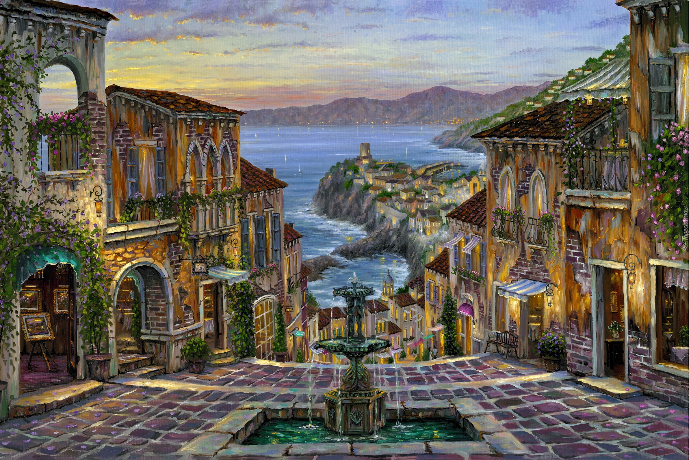 Edytor tapety: Ulica, Domy, Fontanna, Morze