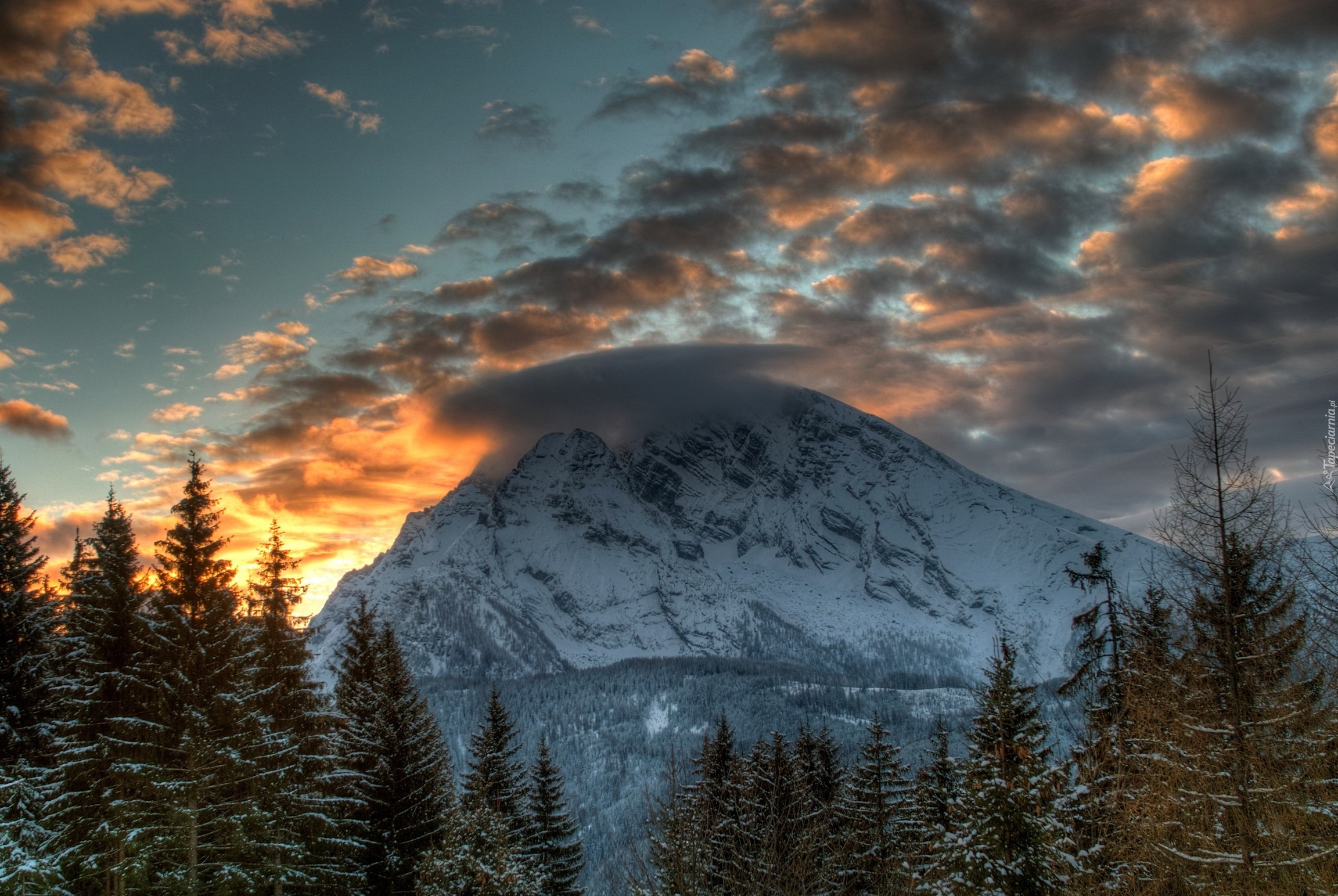 Edytor tapety: Zachód, Słońca, Chmury, Góry, Las, Zima