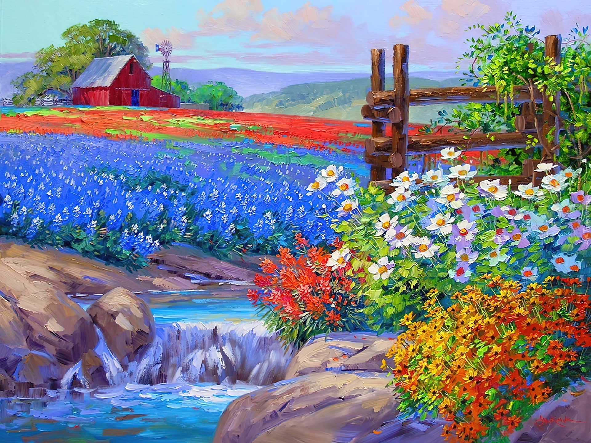 Edytor tapety: Łąka, Rzeczka, Kwiaty