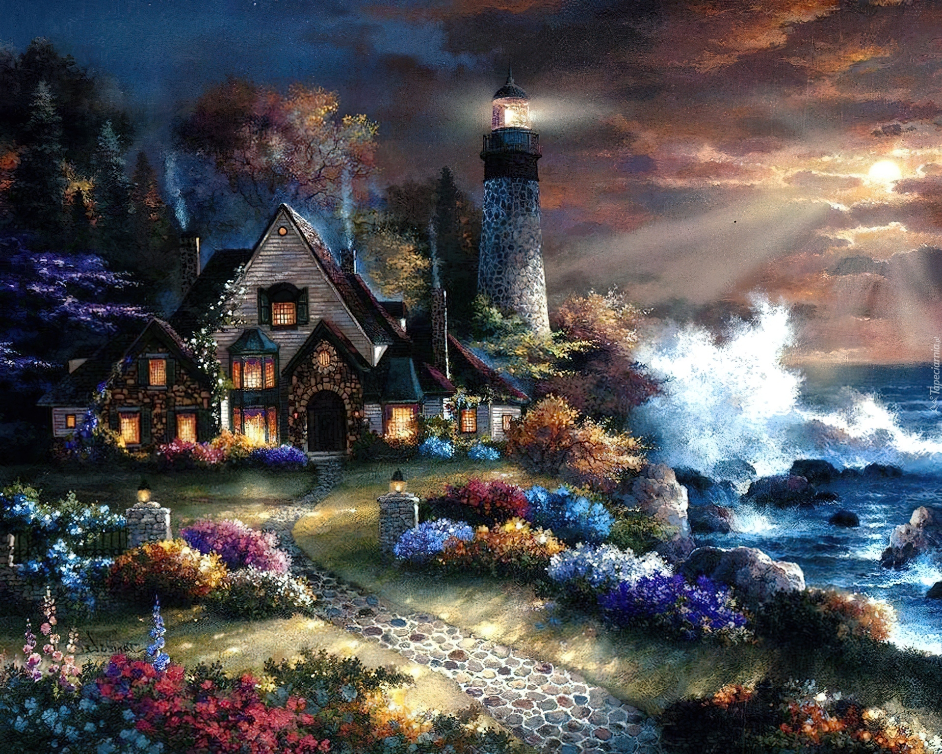 Edytor tapety: Dom, Latarnia, Morska, Dróżka, Morze, Fale