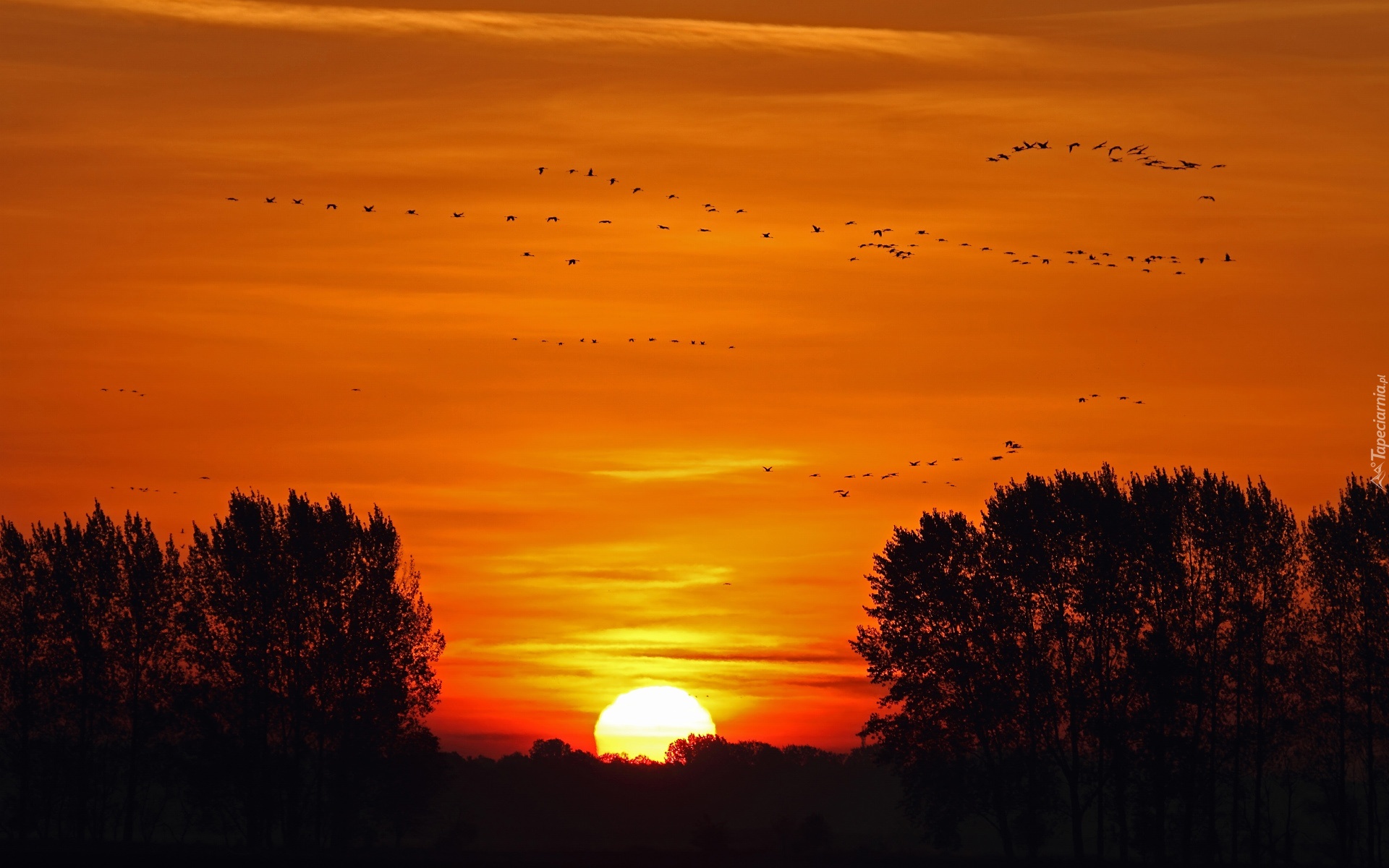 Edytor tapety: Zachód Słońca, Niebo, Klucz, Ptaków, Drzewa