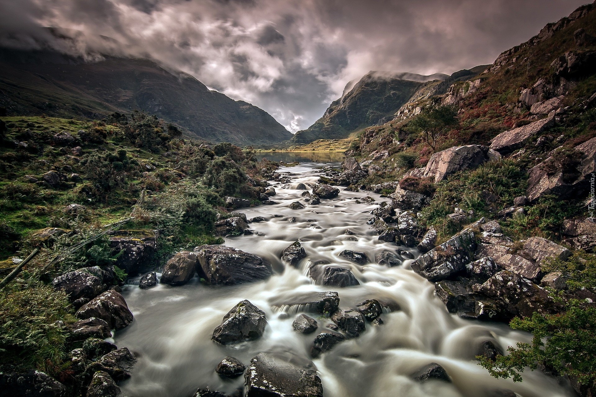 Edytor tapety: Rzeka, Góry, Kamienie, Zachmurzone, Niebo