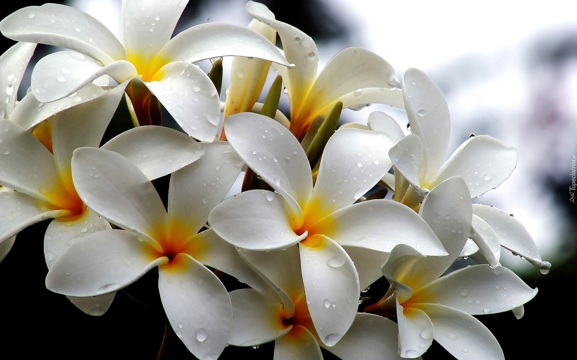 Edytor tapety: Biała, Plumeria, Krople, Wody