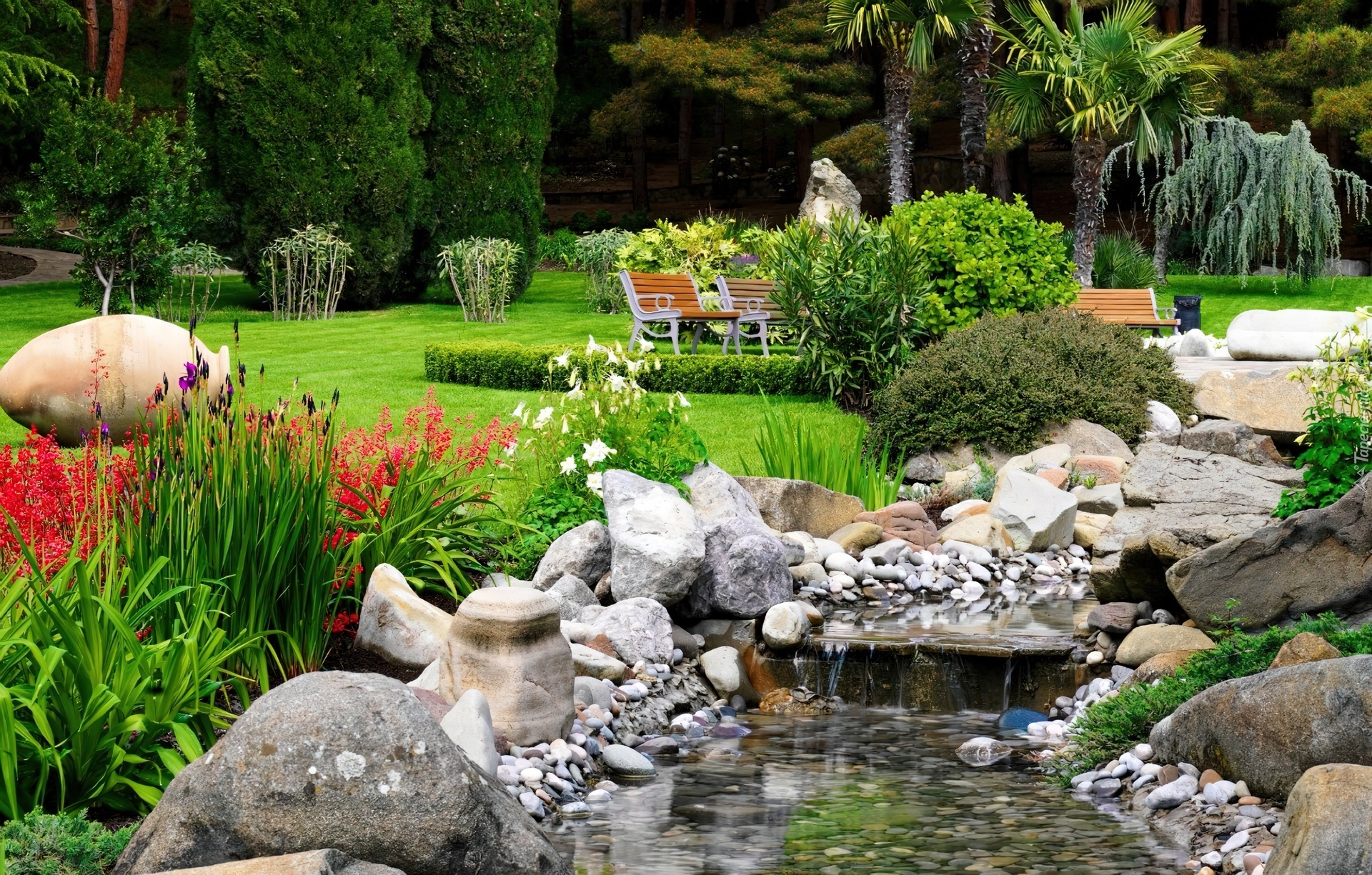 Edytor tapety: Ogród, Rzeczka, Kamienie, Kwiaty