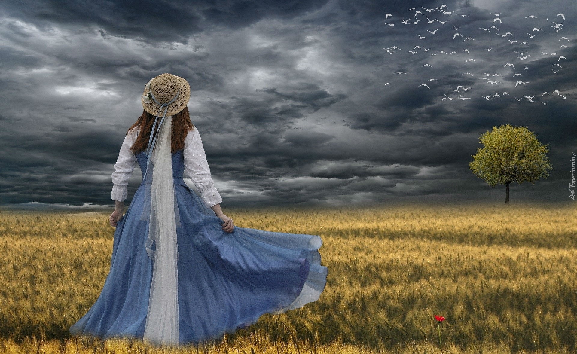Edytor tapety: Pochmurne, Niebo, Zboża, Kobieta, Ptaki