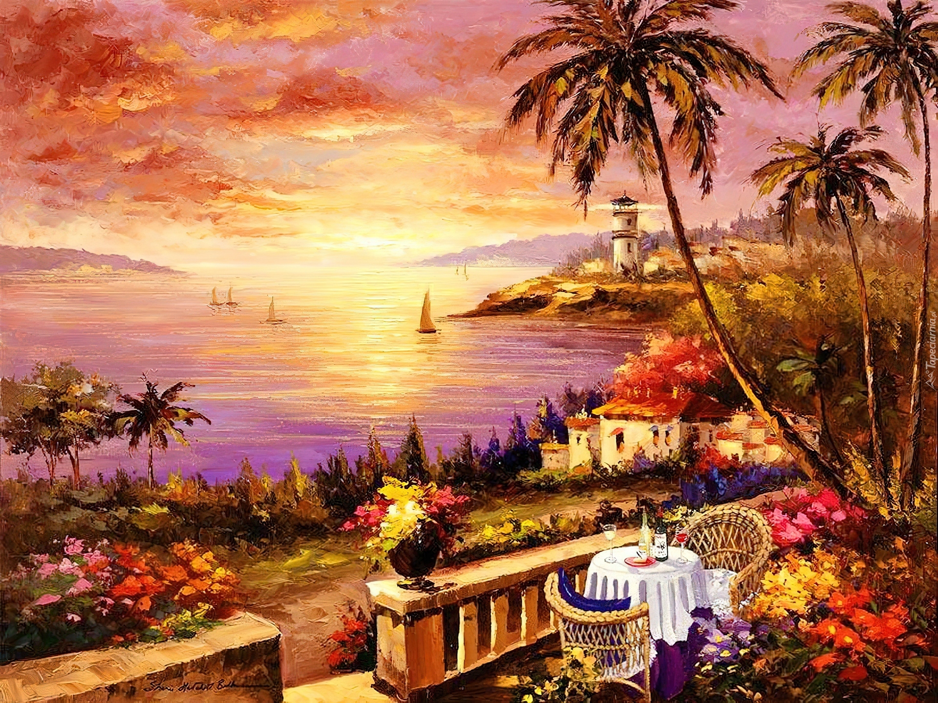 Edytor tapety: Taras, Stolik, Morze, Zachód, Słońca