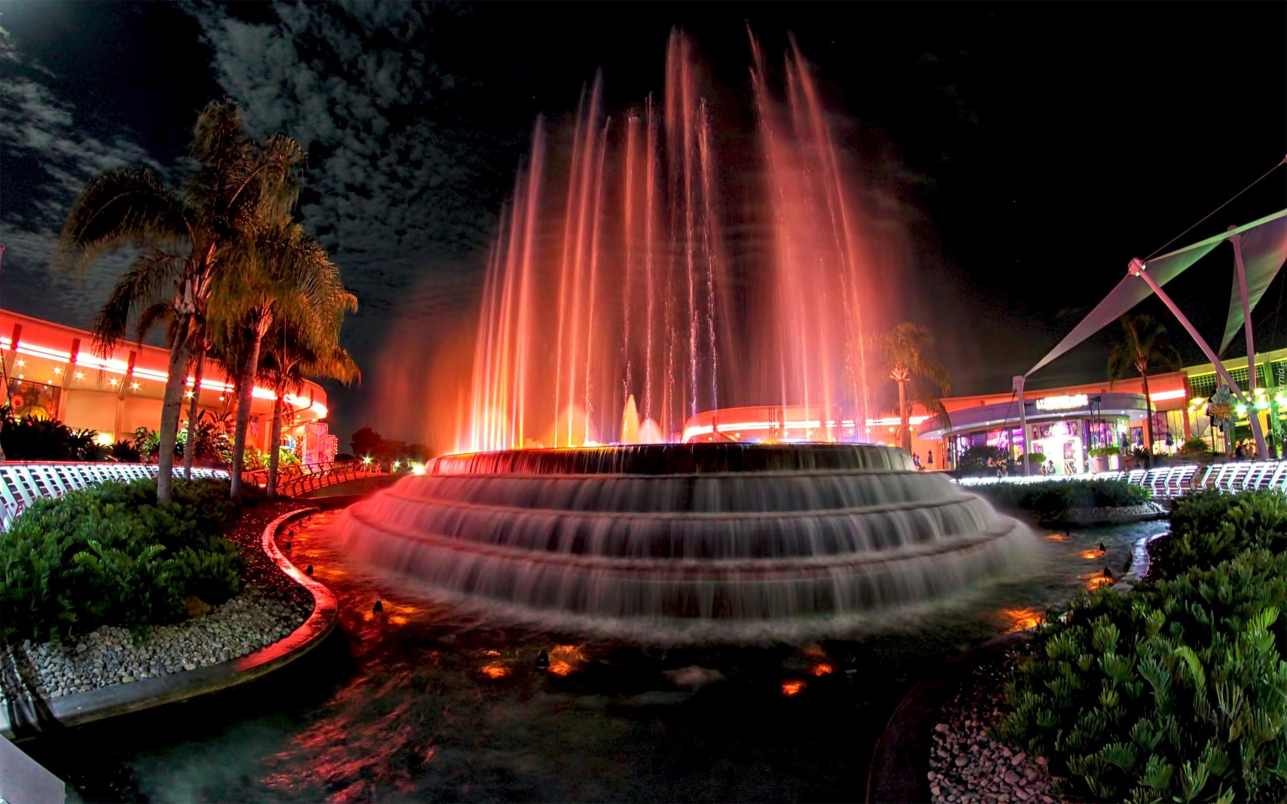 Edytor tapety: Miasto, Nocą, Kolorowa, Fontanna