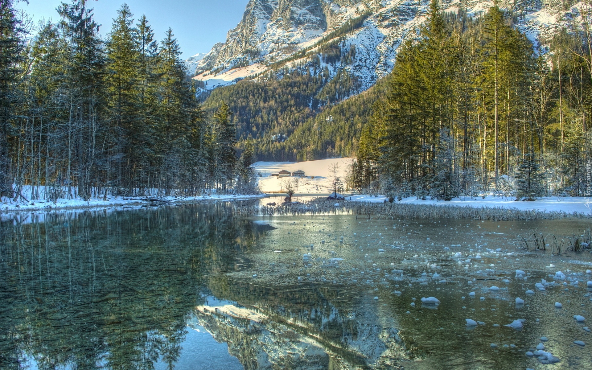 Edytor tapety: Rzeka, Góry, Choinki, Zima