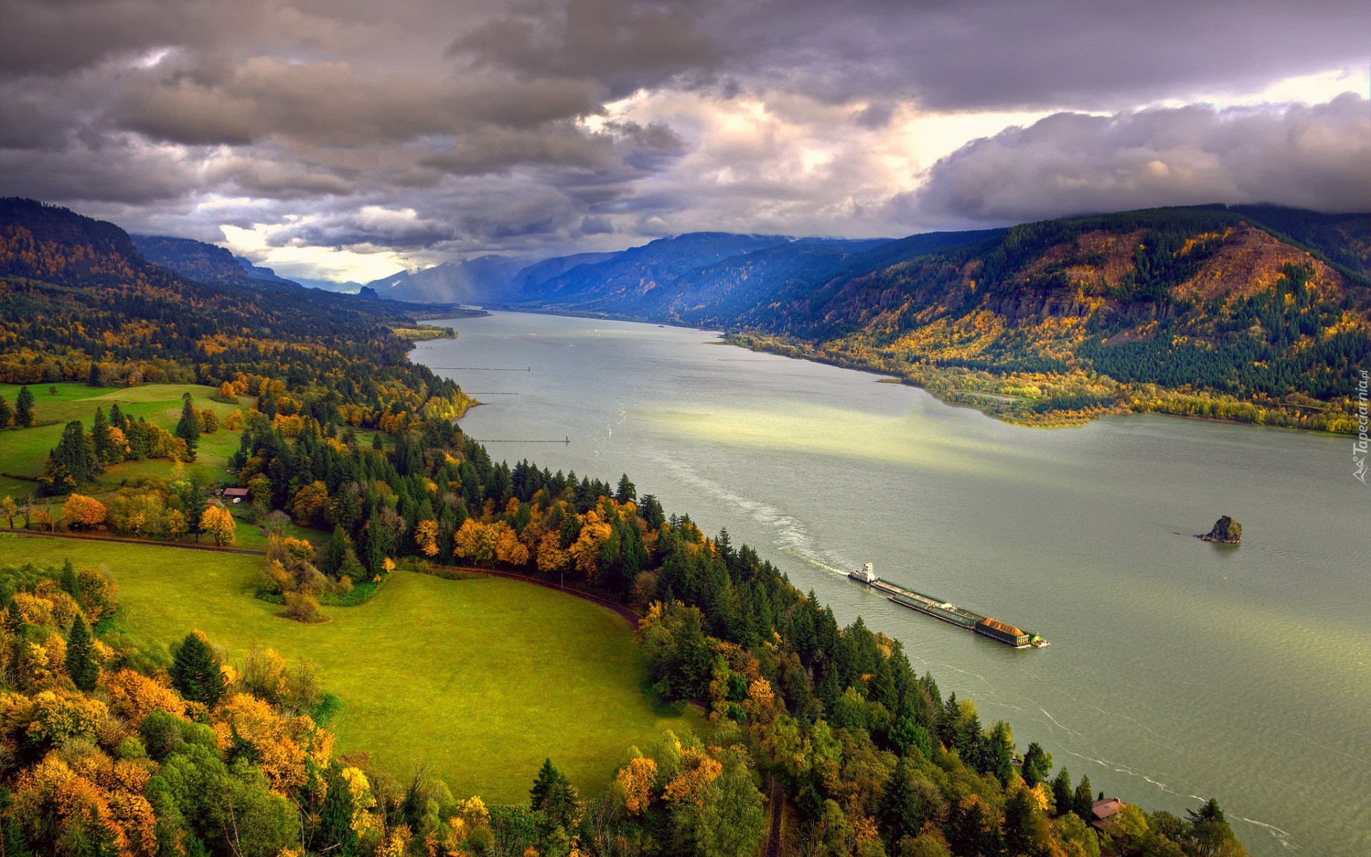 Edytor tapety: Rzeka, Góry, Lasy, Chmury