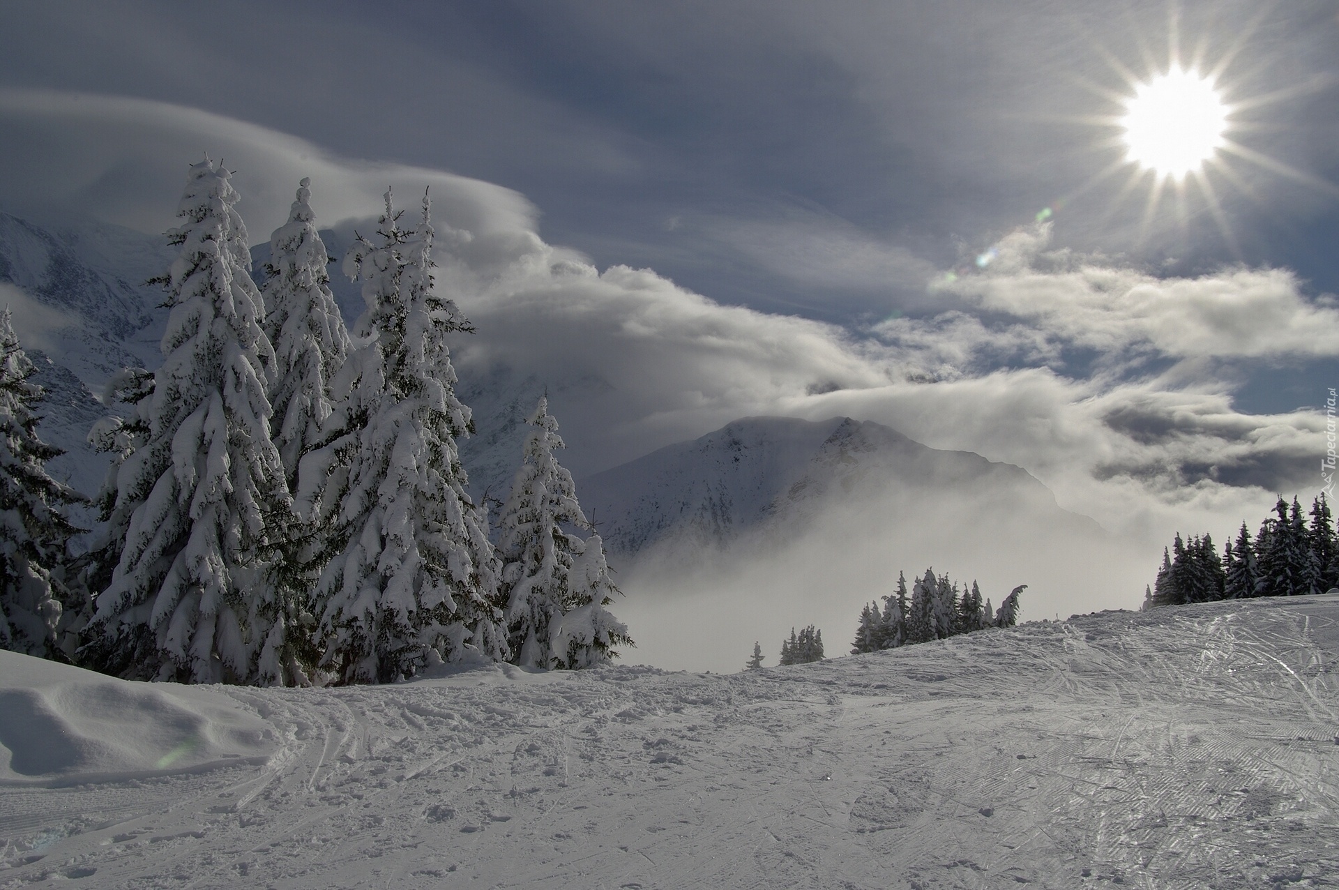 Edytor tapety: Promienie Słońca, Chmury, Góry, Świerki, Zima