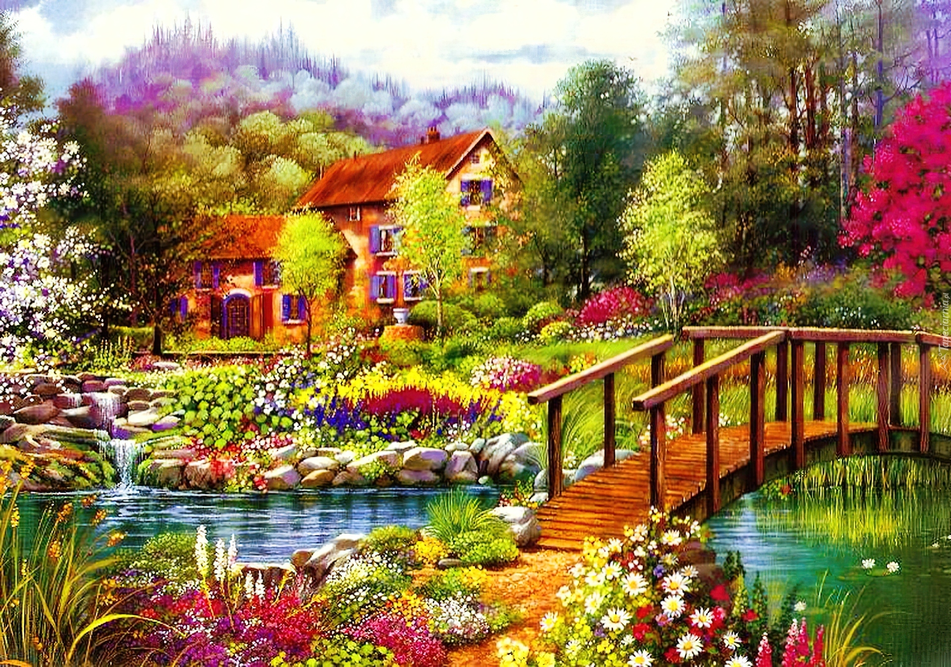 Edytor tapety: Ogród, Mostek, Rzeka, Dom, Kwiaty