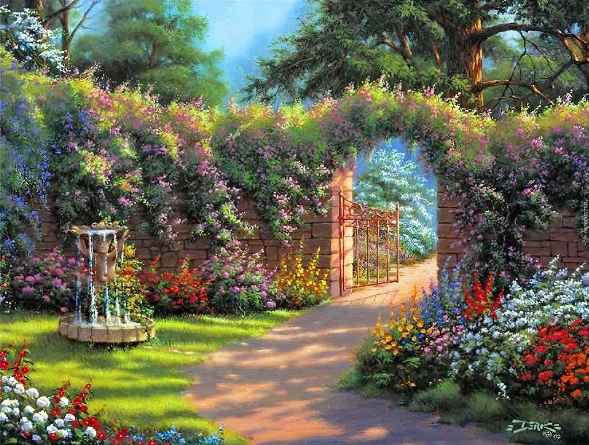 Edytor tapety: Ogród, Mur, Brama, Kwiaty