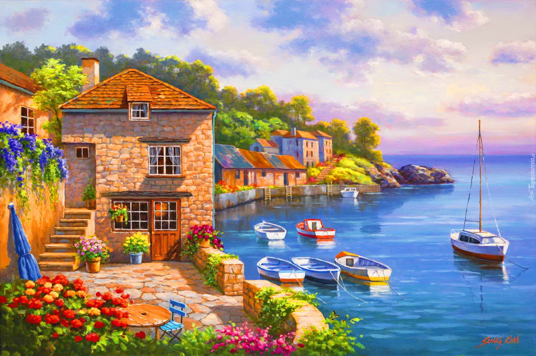 Edytor tapety: Dom, Taras, Morze, Łódki