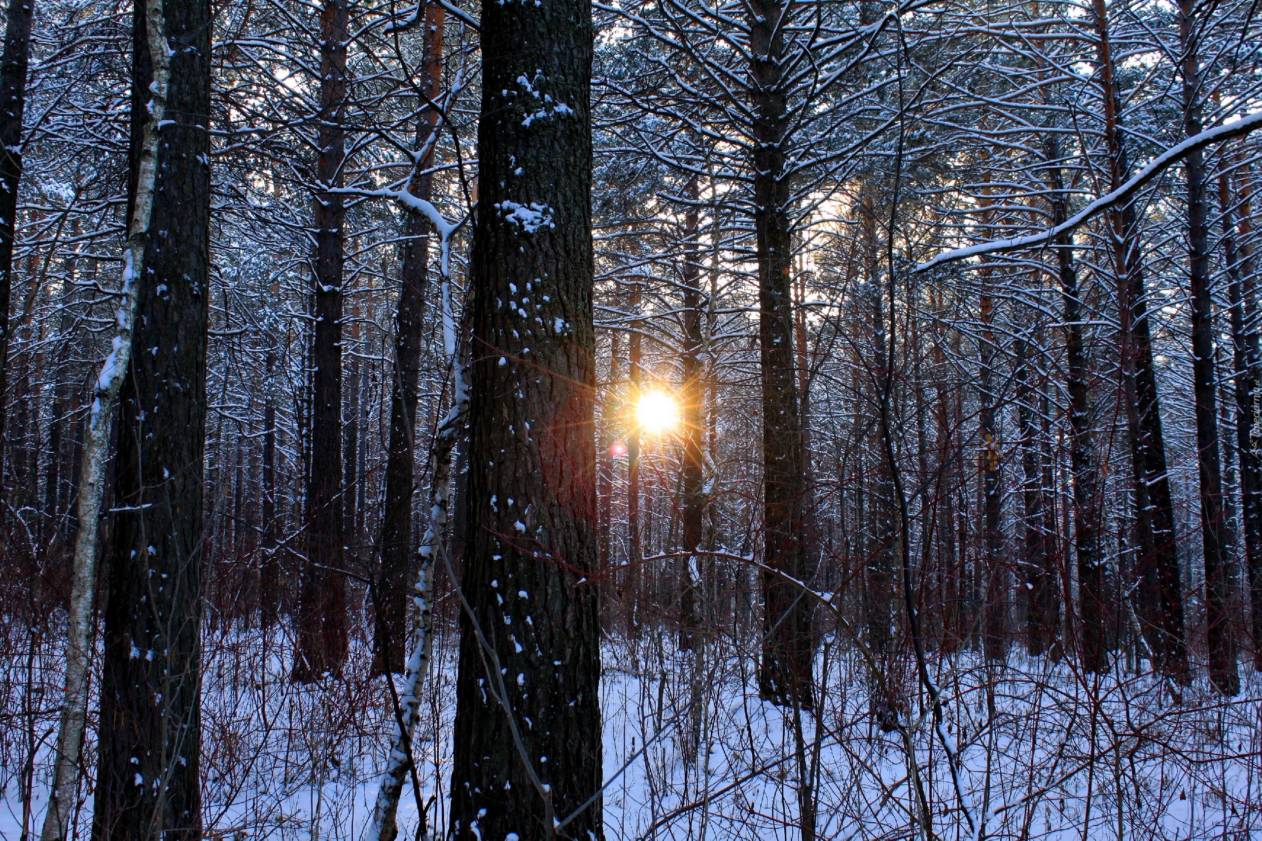 Edytor tapety: Las, Drzewa, Prześwitujące, Słońce, Zima