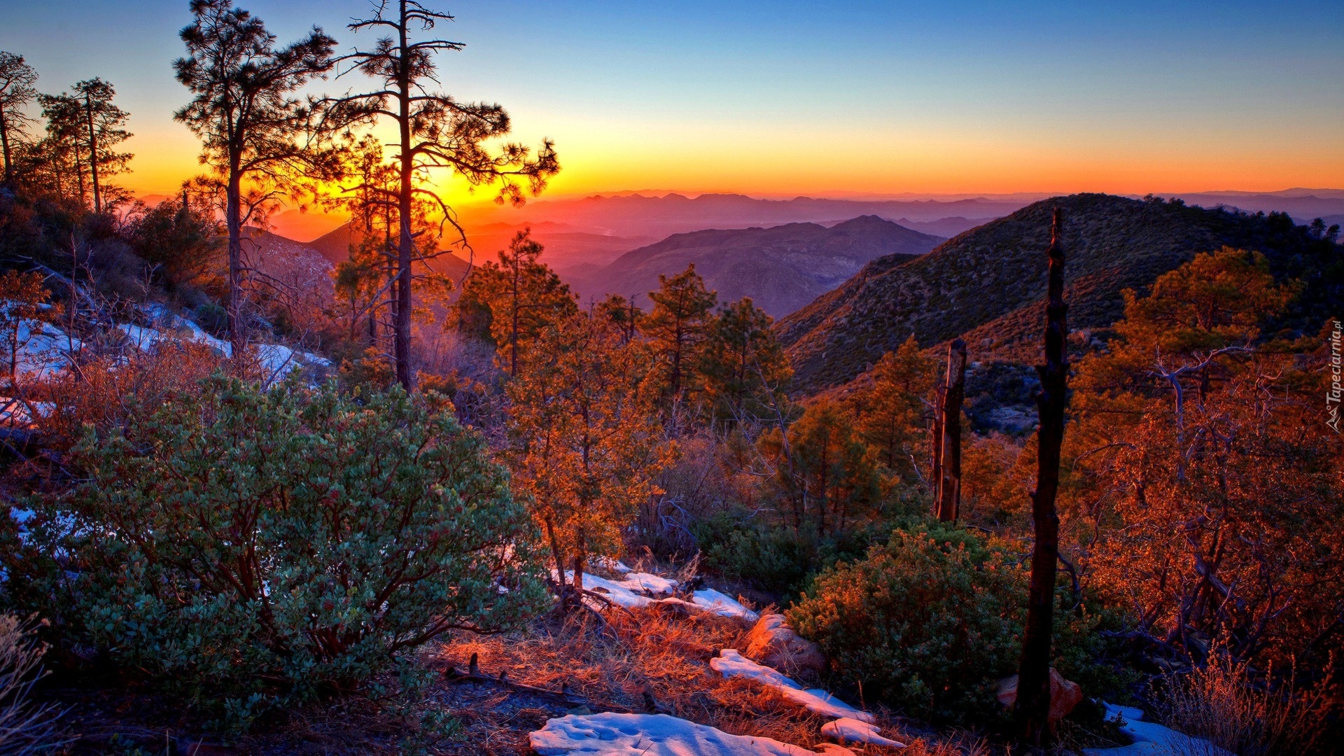 Edytor tapety: Góry, Drzewa, Zachód, Słońca