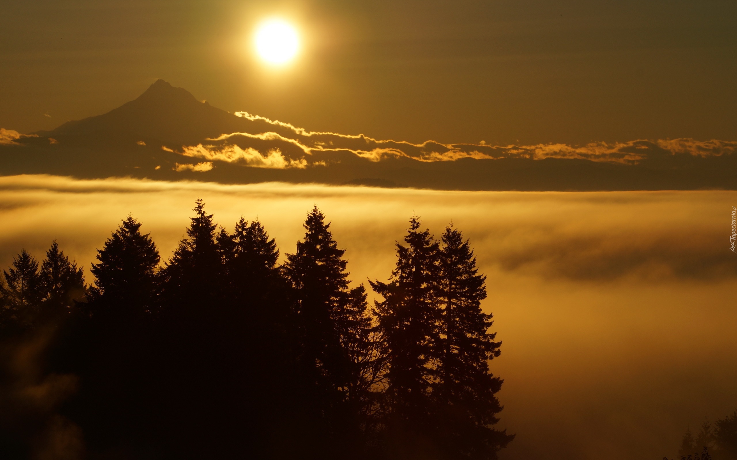 Edytor tapety: Góry, Chmury, Drzewa, Słońce