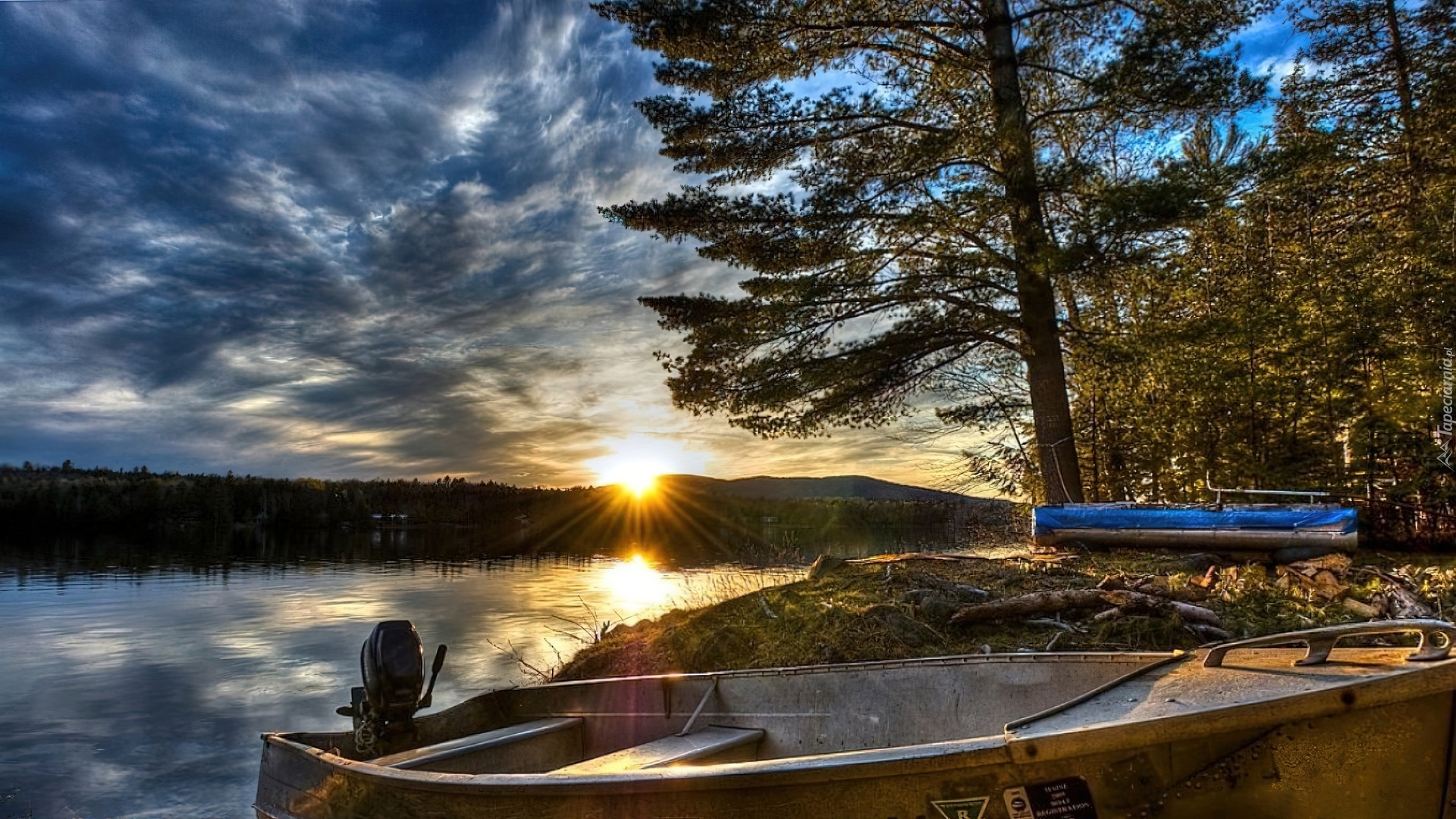 Edytor tapety: Zachodzące, Słońce, Jezioro, Łódź