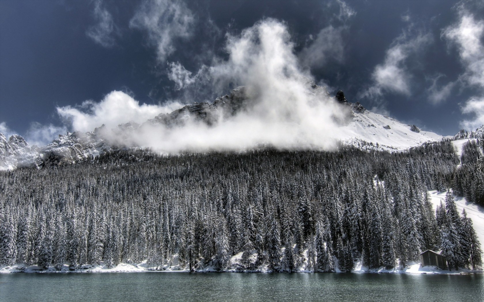 Edytor tapety: Chmury, Góry, Las, Rzeka