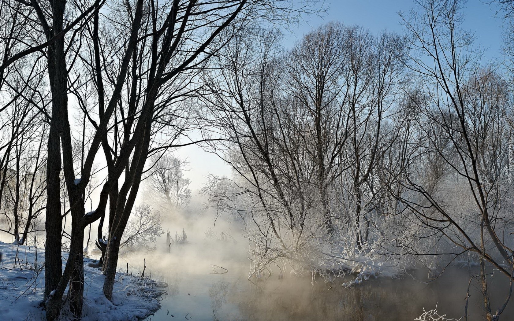 Edytor tapety: Drzewa, Rzeka, Mgła, Zima