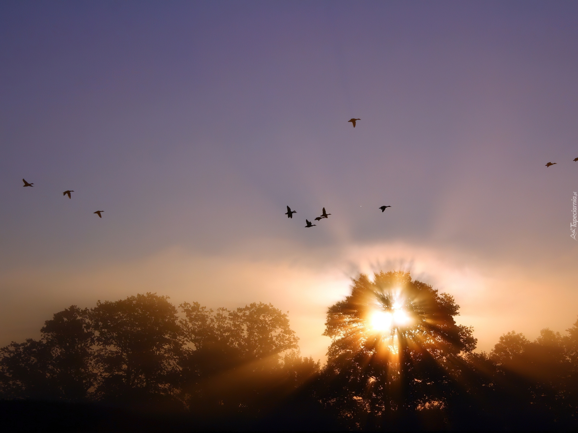 Edytor tapety: Zachód, Słońca, Drzewa, Lot, Ptaków