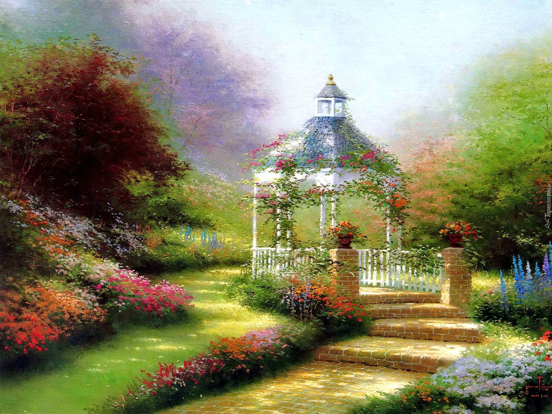 Edytor tapety: Ogród, Altanka, Trawnik, Kwiaty, Alejka