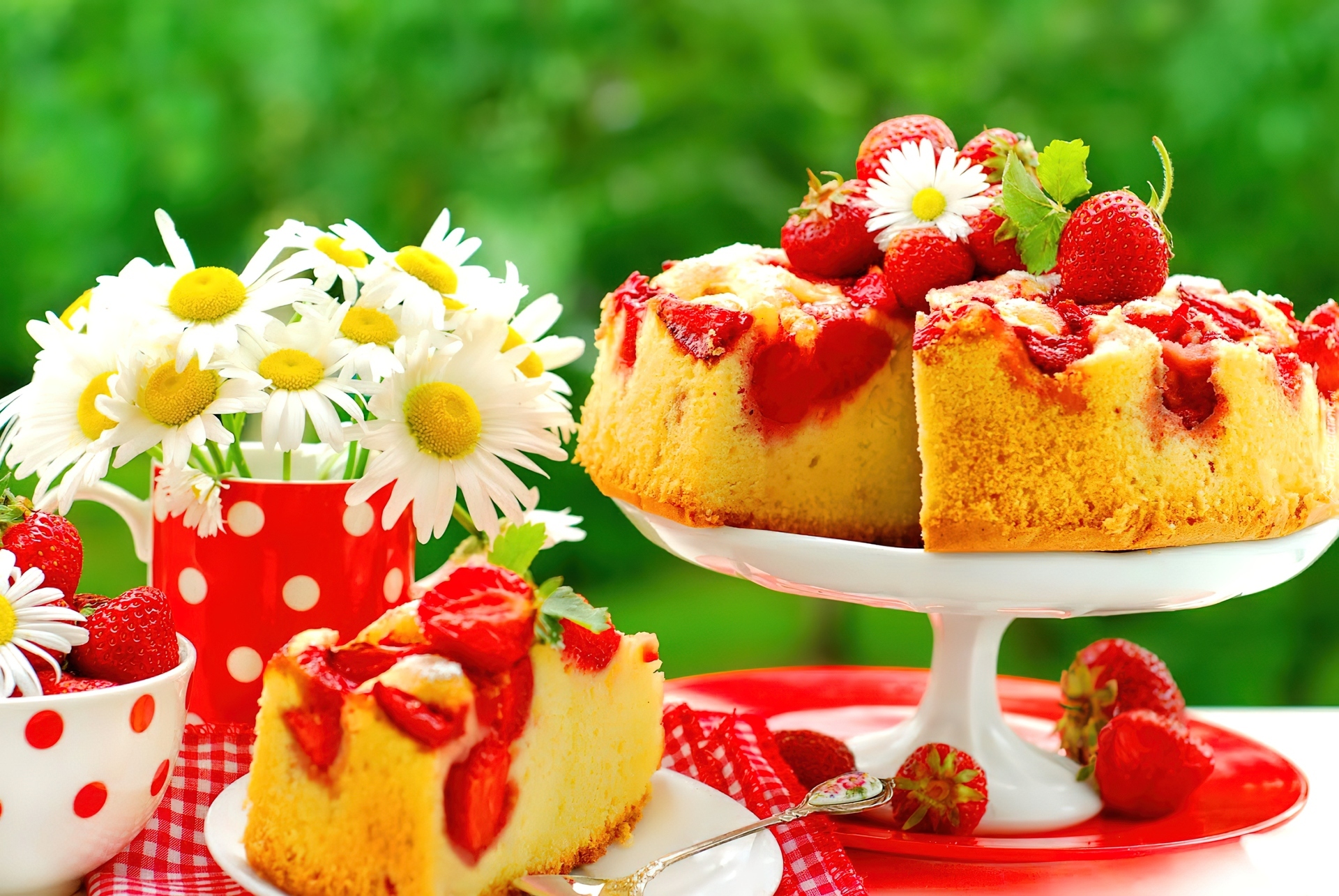 Edytor tapety: Ciasto, Truskawki, Kawiaty, Talerze