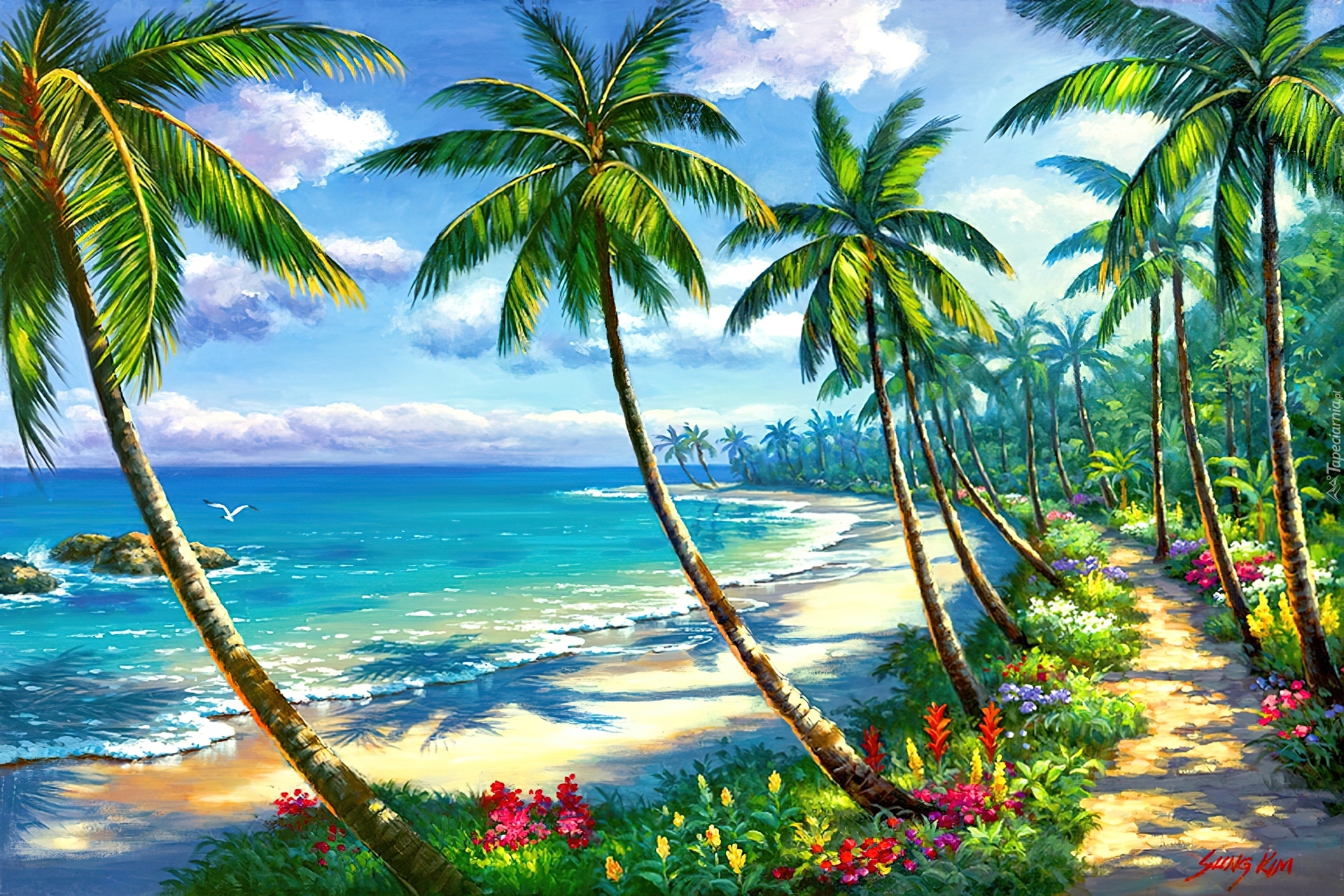 Edytor tapety: Morze, Plaża, Palmy, Kwiaty, Obraz, Sung Kim