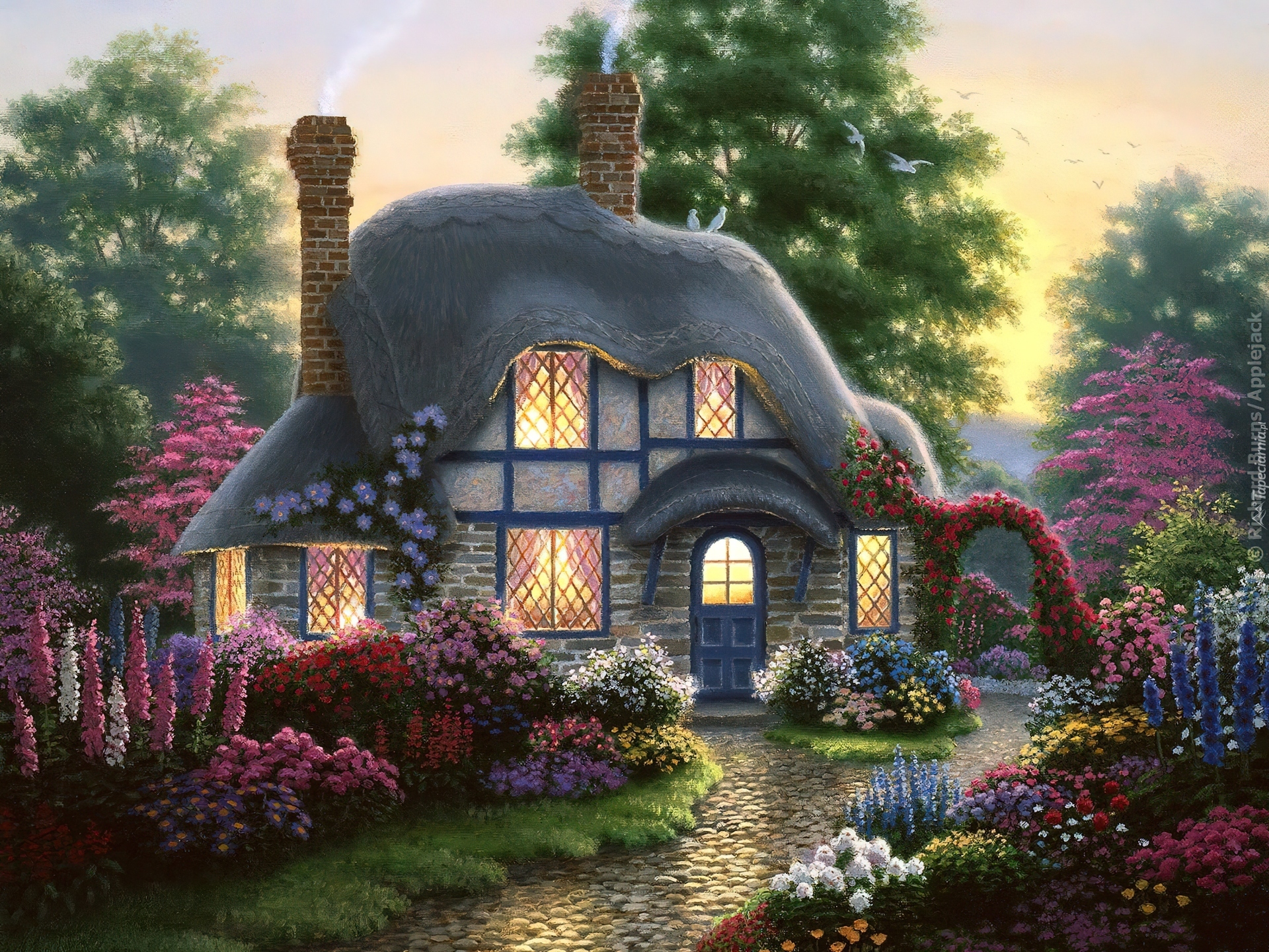 Edytor tapety: Dom, Droga, Ogród, Thomas Kinkade