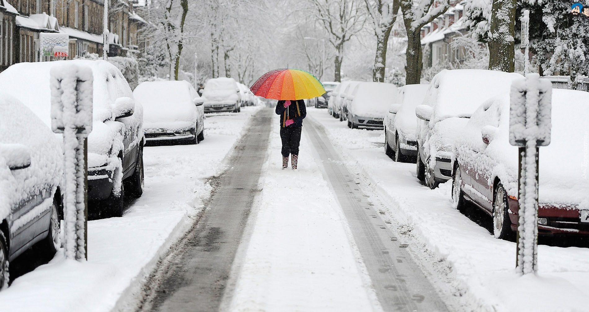 Edytor tapety: Zima, Ulica, Samochody, Kobieta, Kolorowa, Parasolka