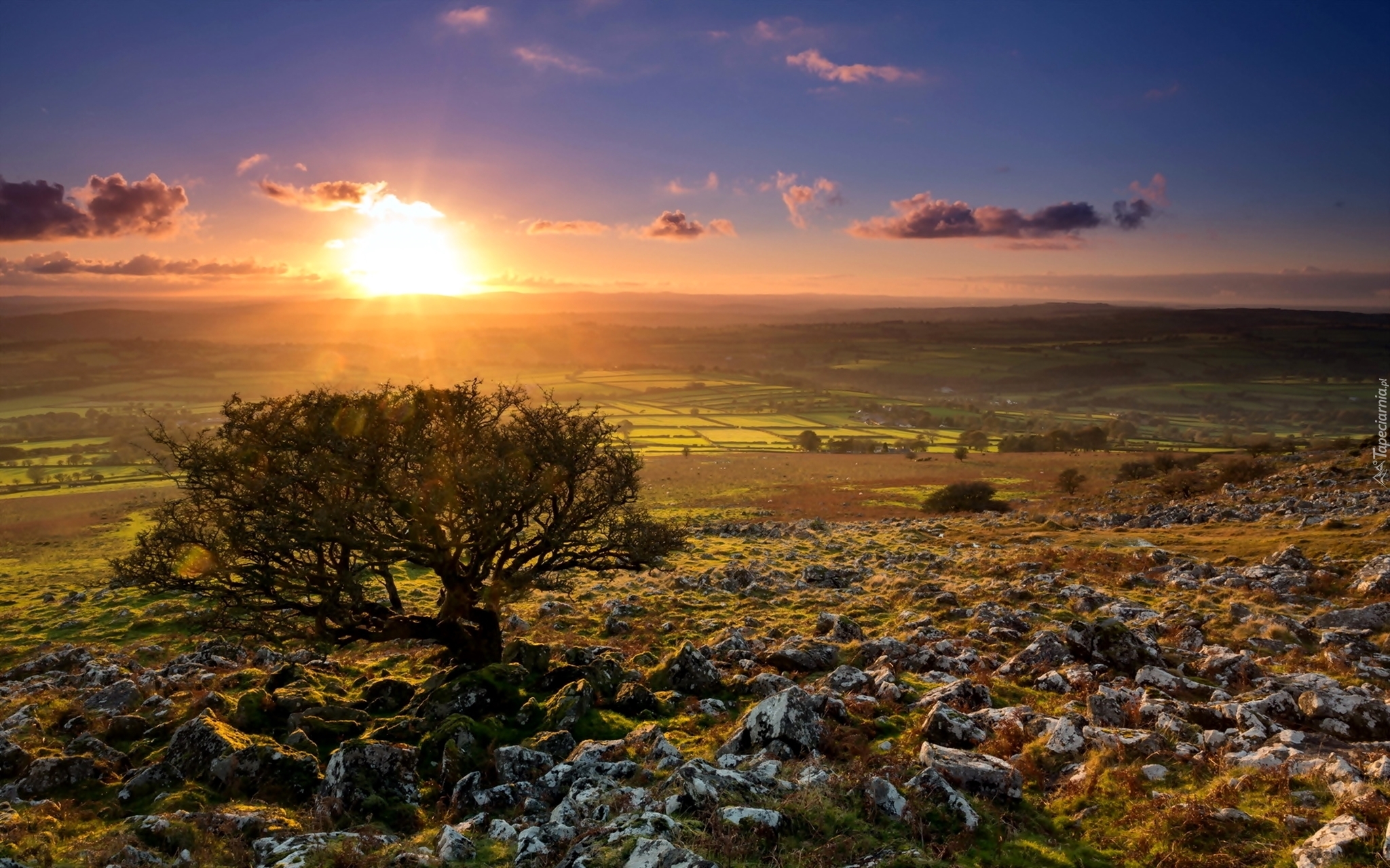 Edytor tapety: Zachód, Słońca, Drzewo, Skałki