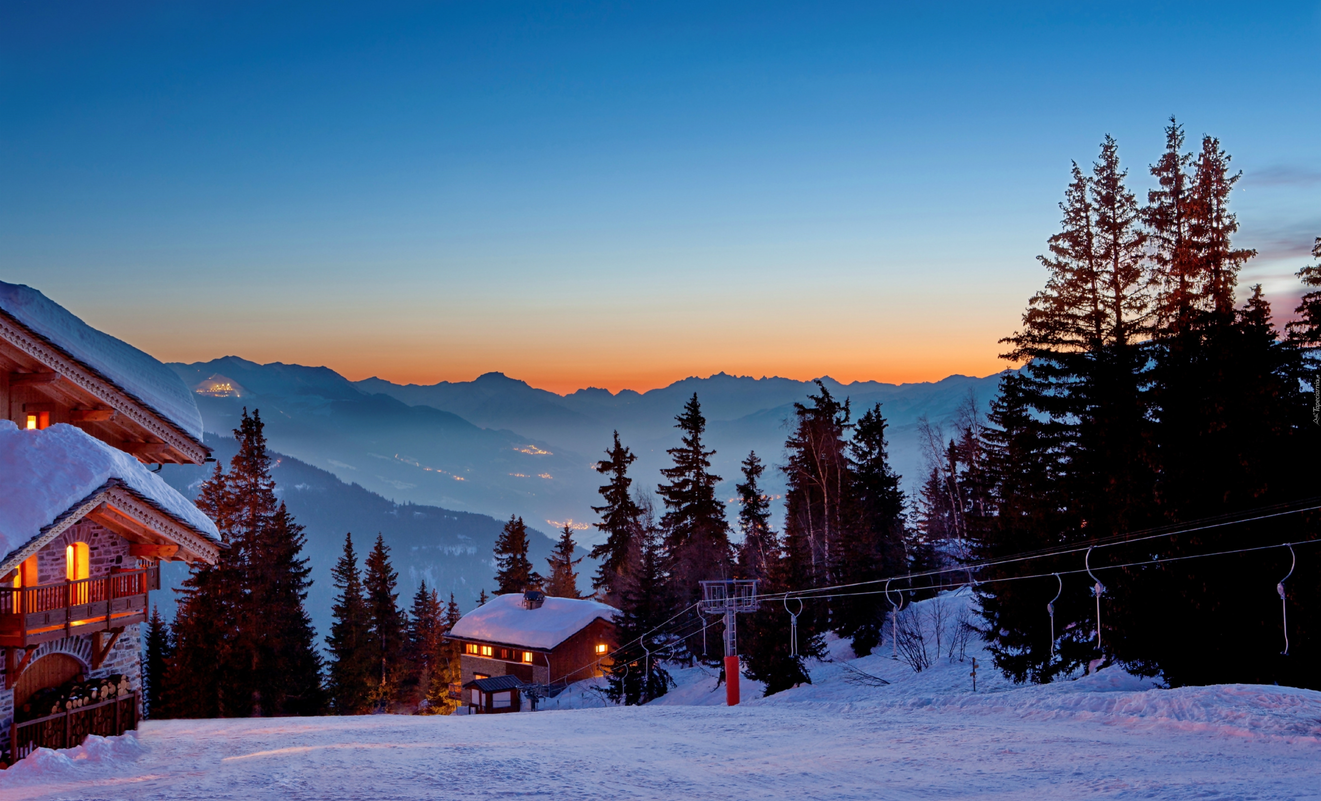 Edytor tapety: Zima, Góry, Oświetlone, Domy, Zmrok