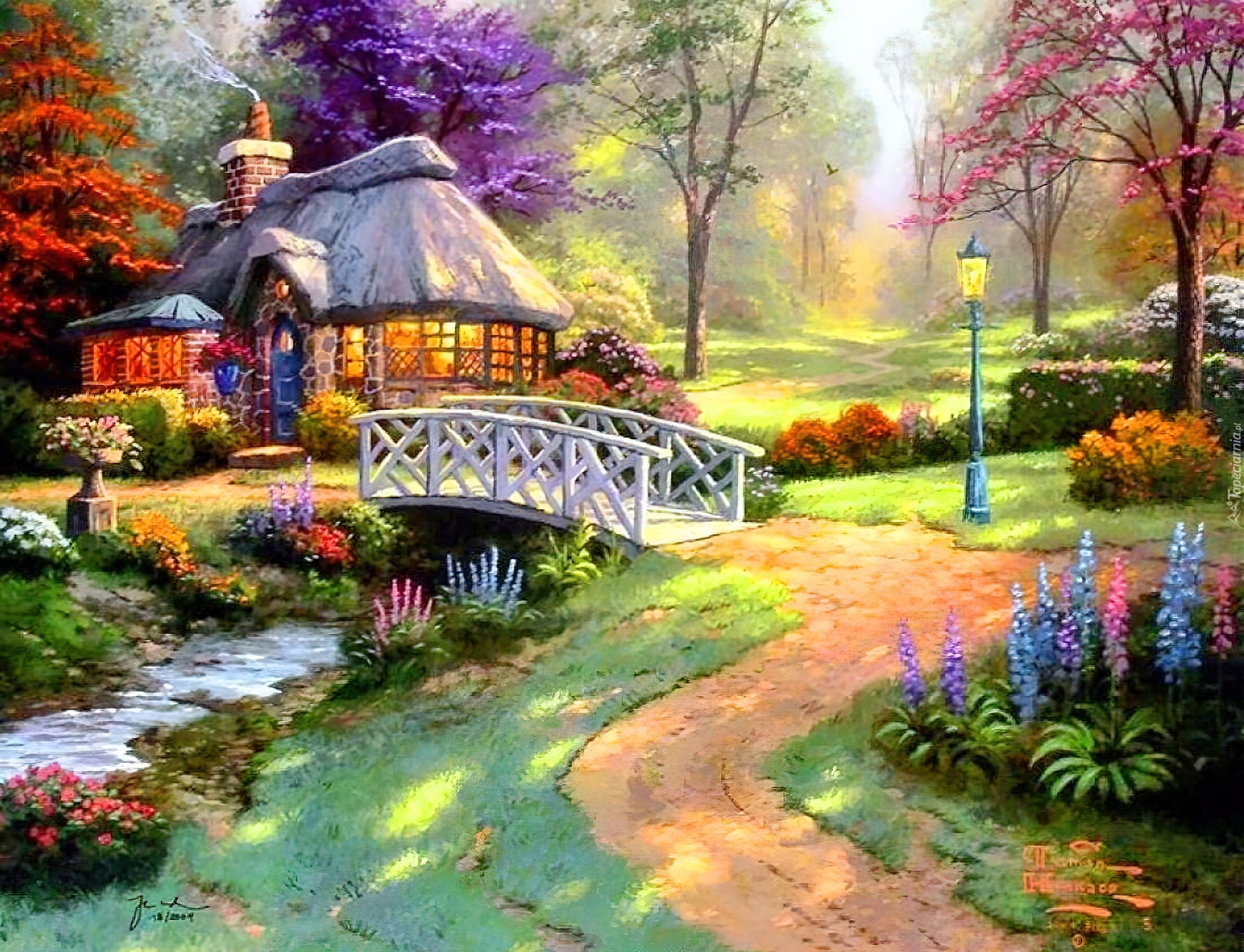 Edytor tapety: Dom, Most, Rzeka, Droga, Kwiaty