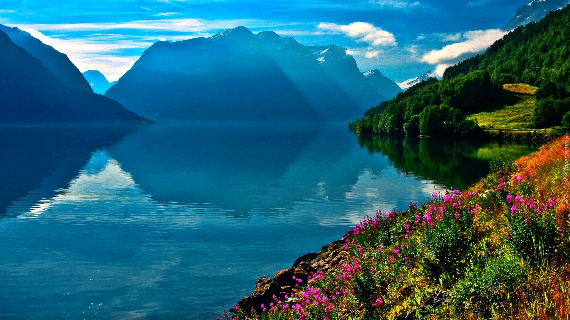 Edytor tapety: Góry, Jezioro, Kwiaty