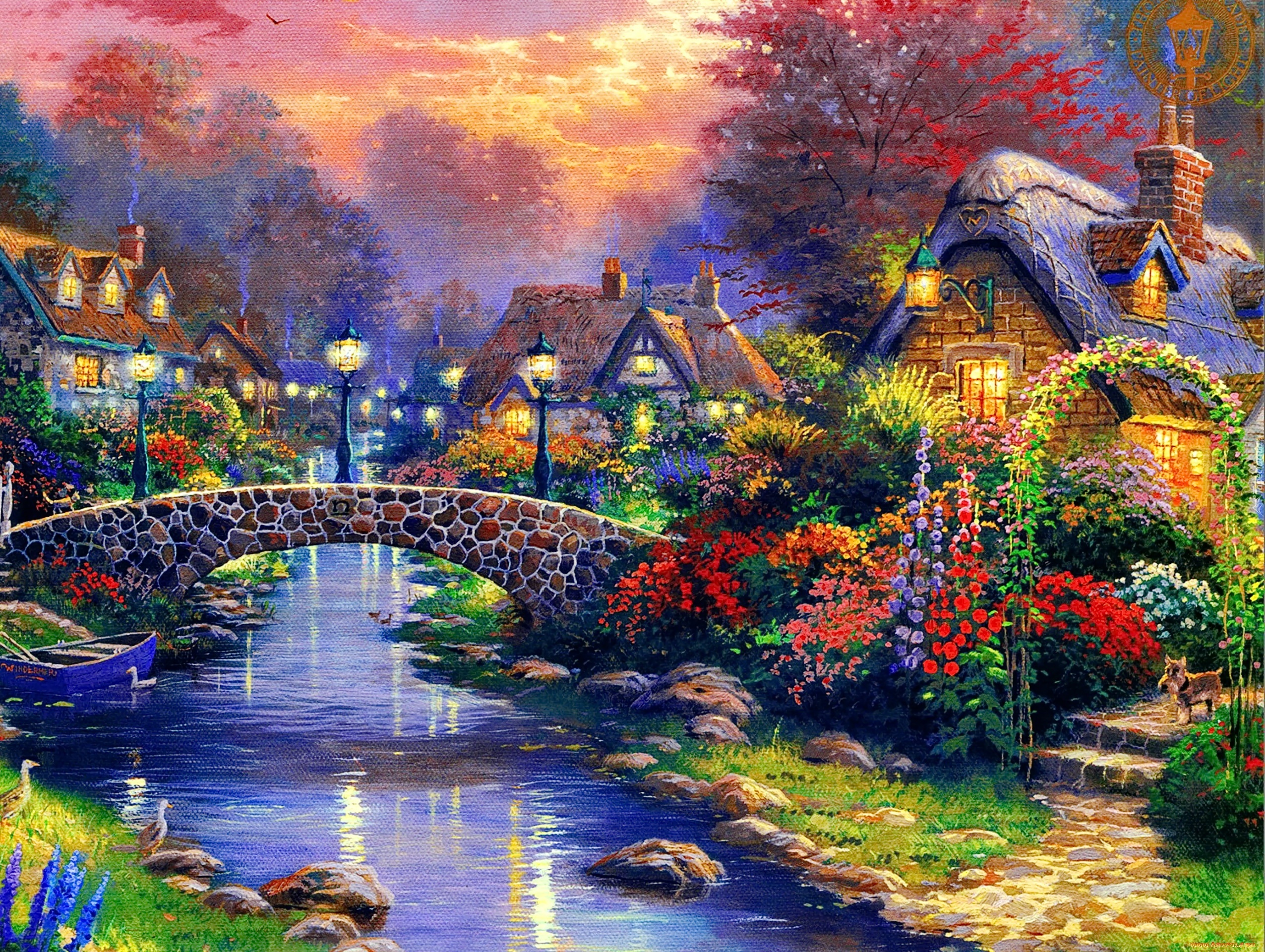 Edytor tapety: Domy, Most, Rzeka, Kwiaty