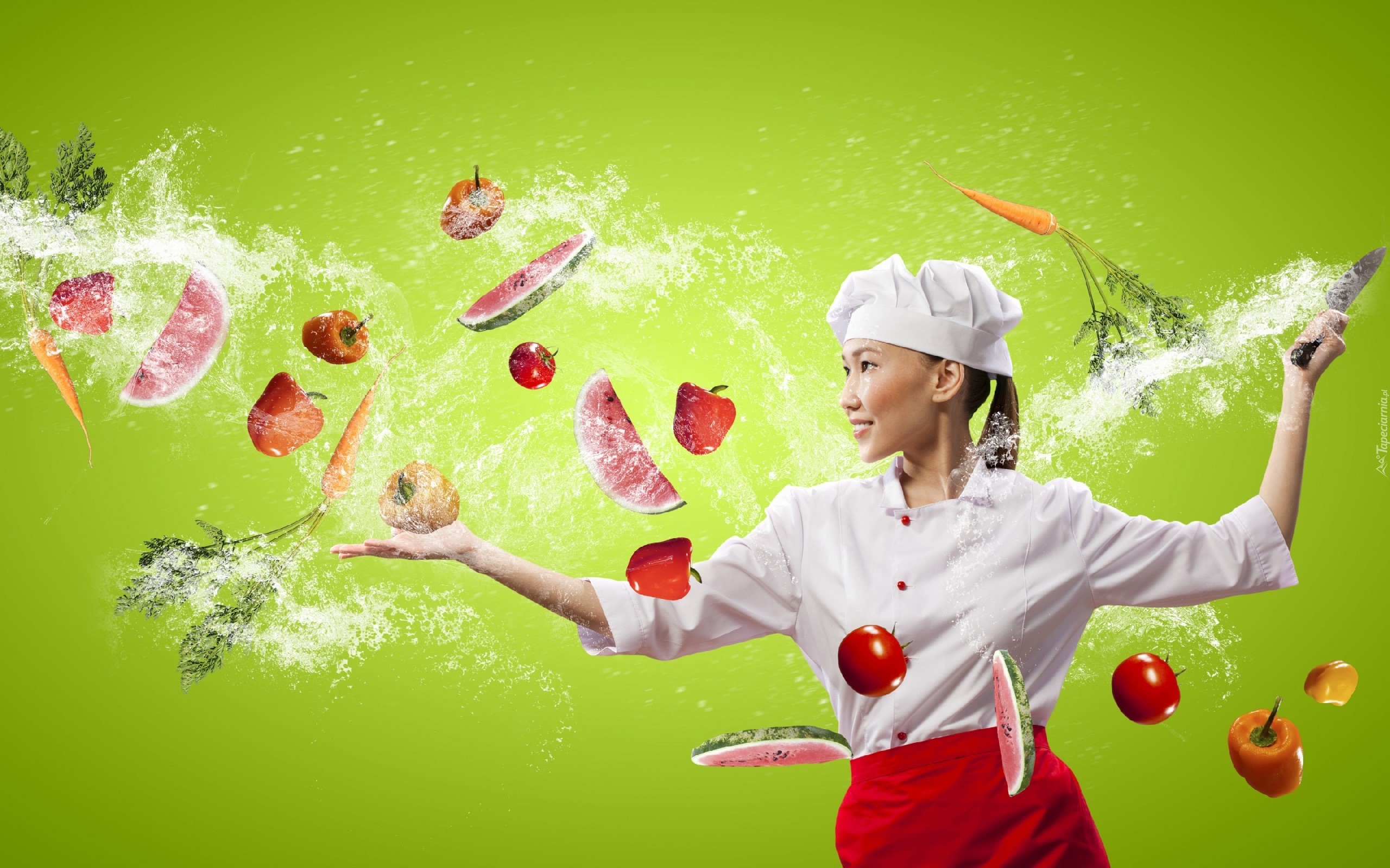 Edytor tapety: Kobieta, Kucharka, Warzywa, Owoce