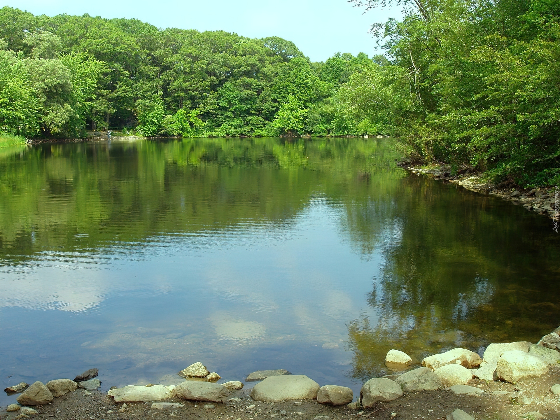 Edytor tapety: Jezioro, Kamienie, Drzewa