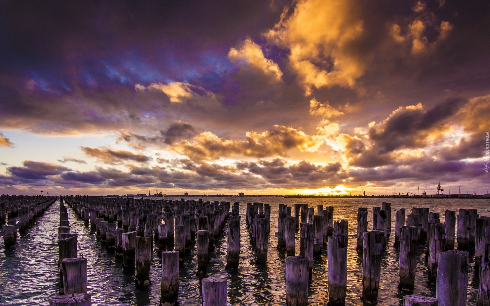 Edytor tapety: Zachód, Słońca, Morze, Pale