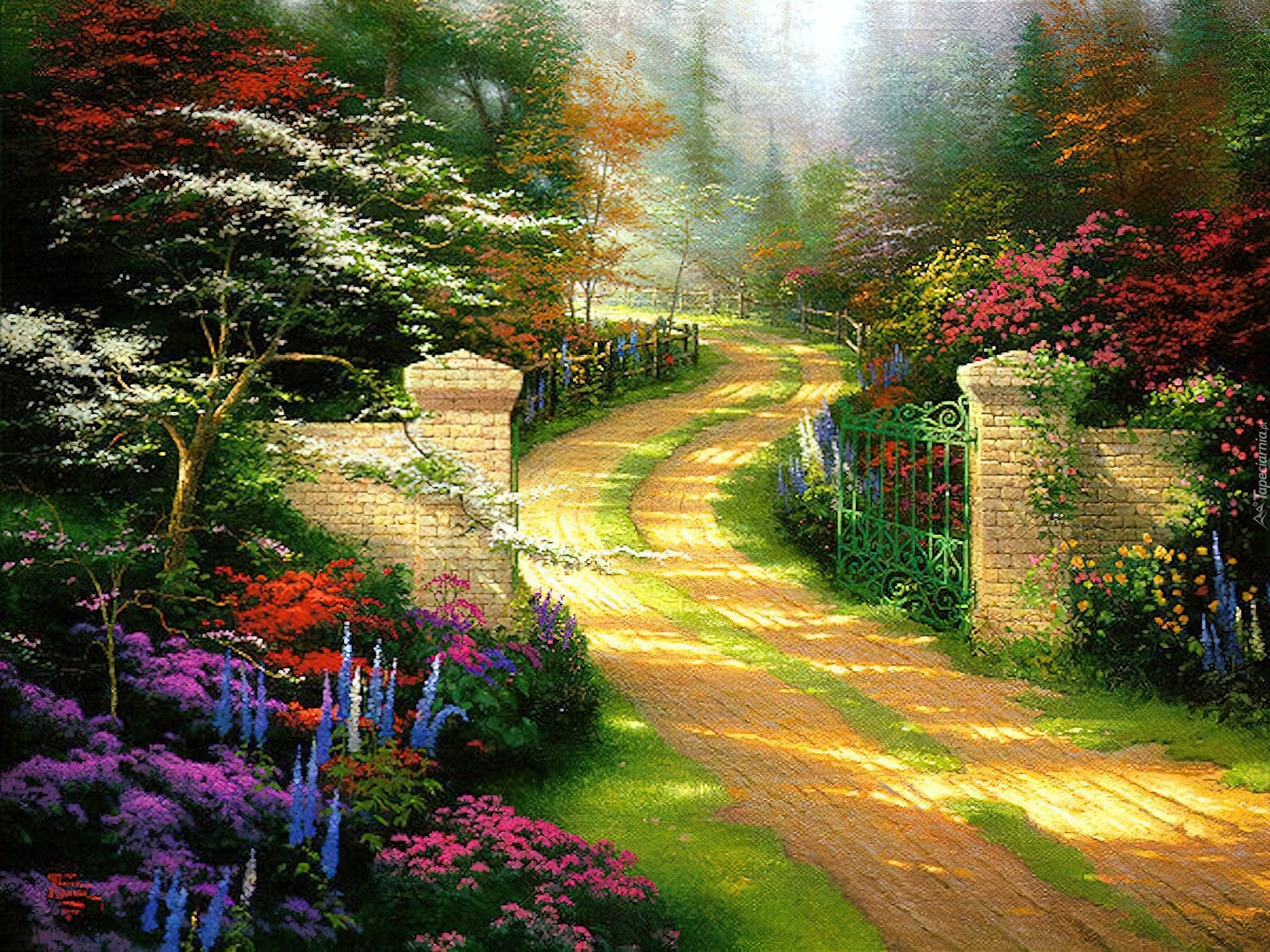 Edytor tapety: Droga, Brama, Kwiaty, Thomas Kinkade