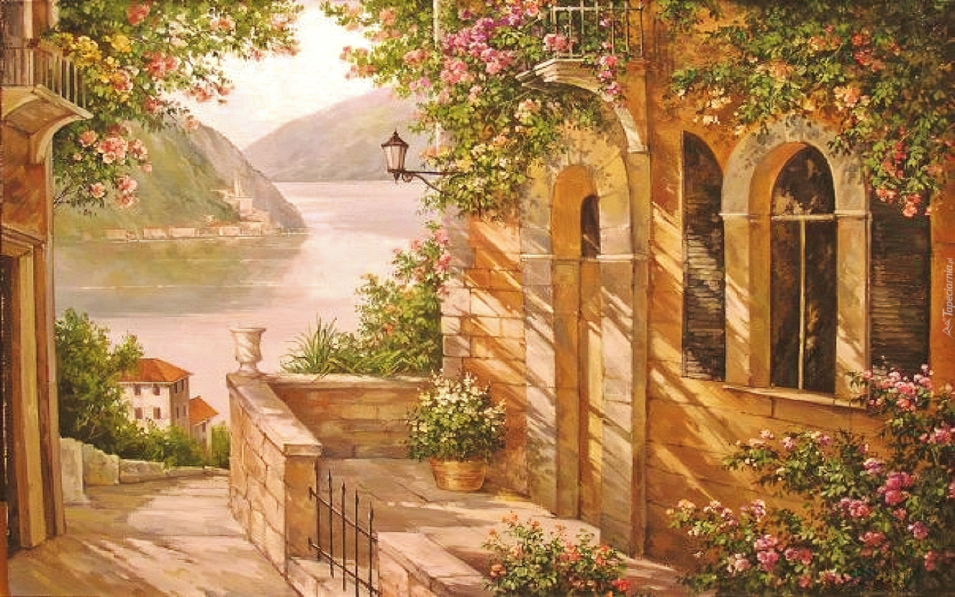 Edytor tapety: Uliczka, Dom, Kwiaty, Morze