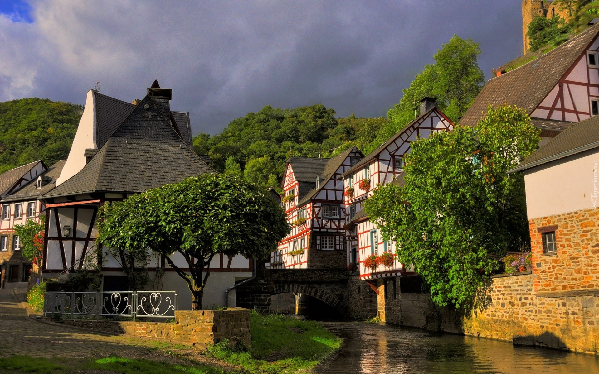 Edytor tapety: Domy, Drzewa, Rzeka, Most