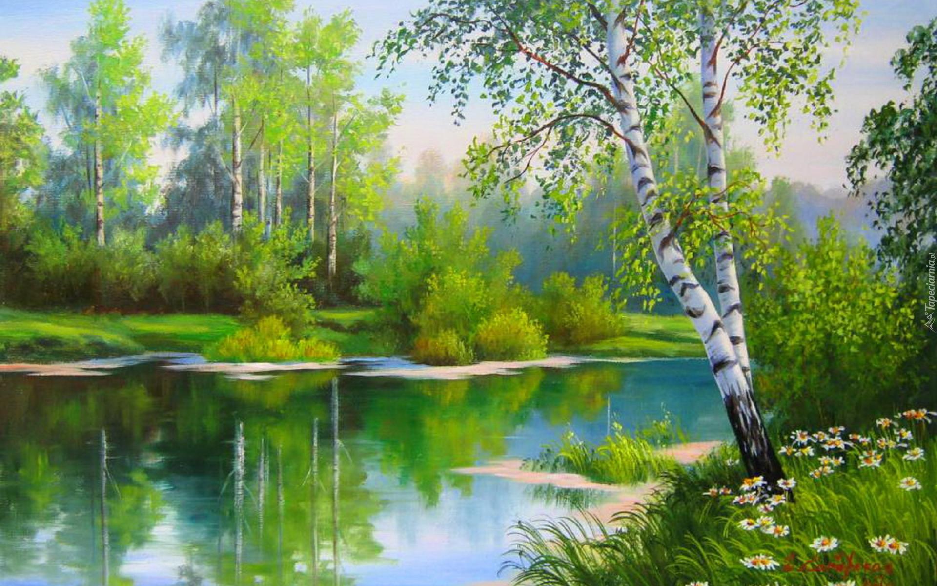 Edytor tapety: Rzeka, Łąka, Kwiaty, Drzewa
