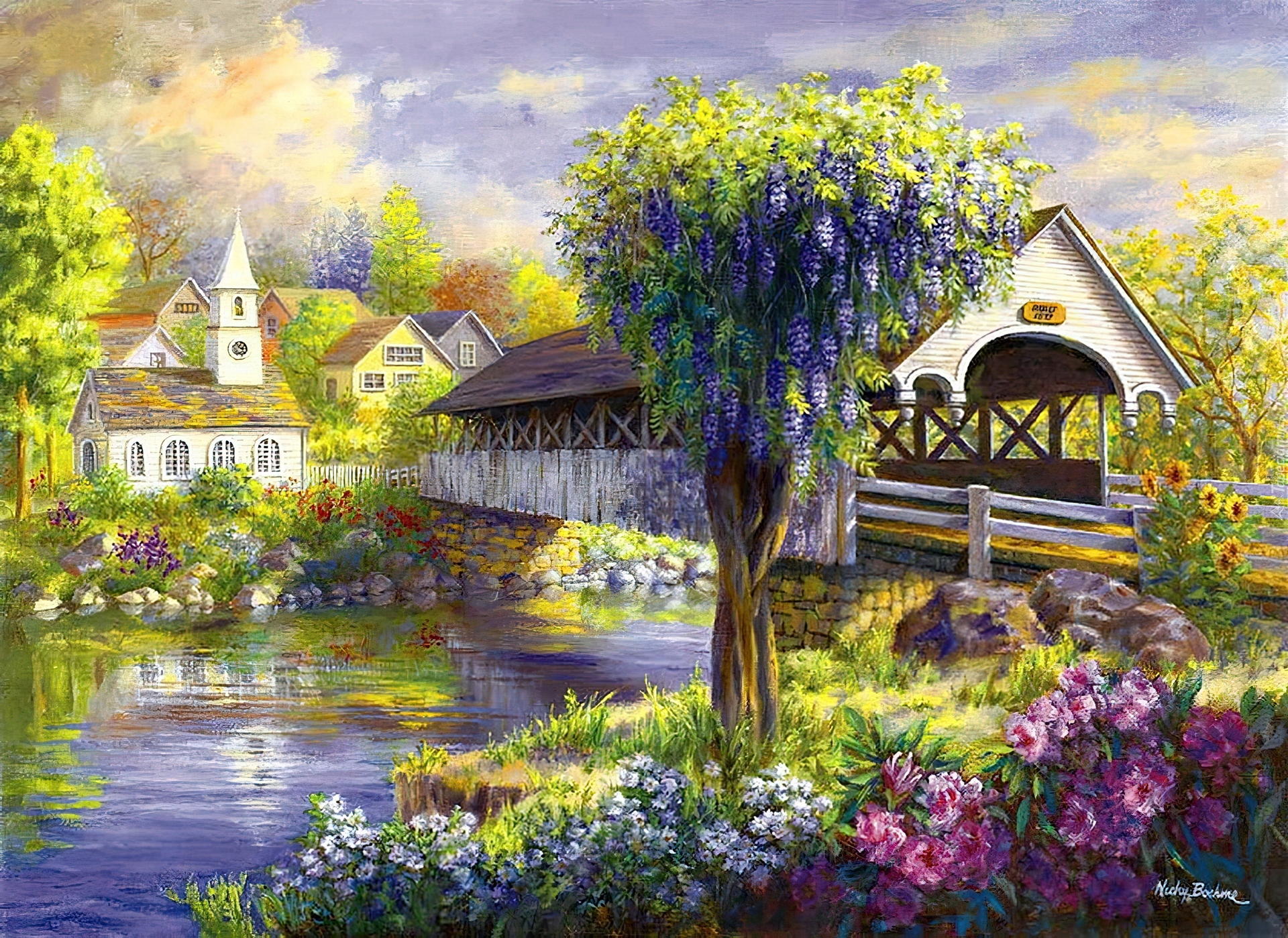 Edytor tapety: Rzeka, Kryty, Most, Domy